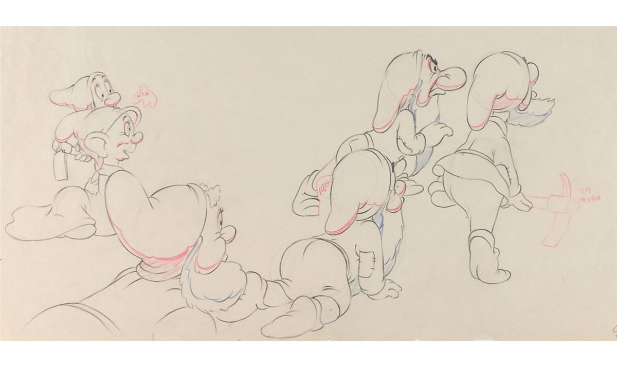Bashful, Grumpy, Happy, Sleepy, Sneezy, and Dopey production drawing from Snow White and the Seven D