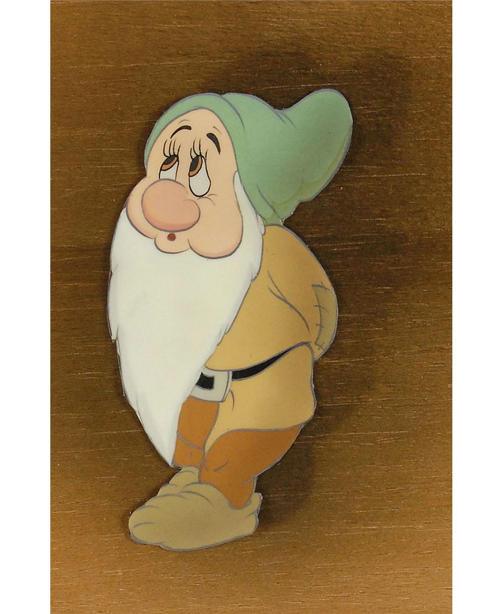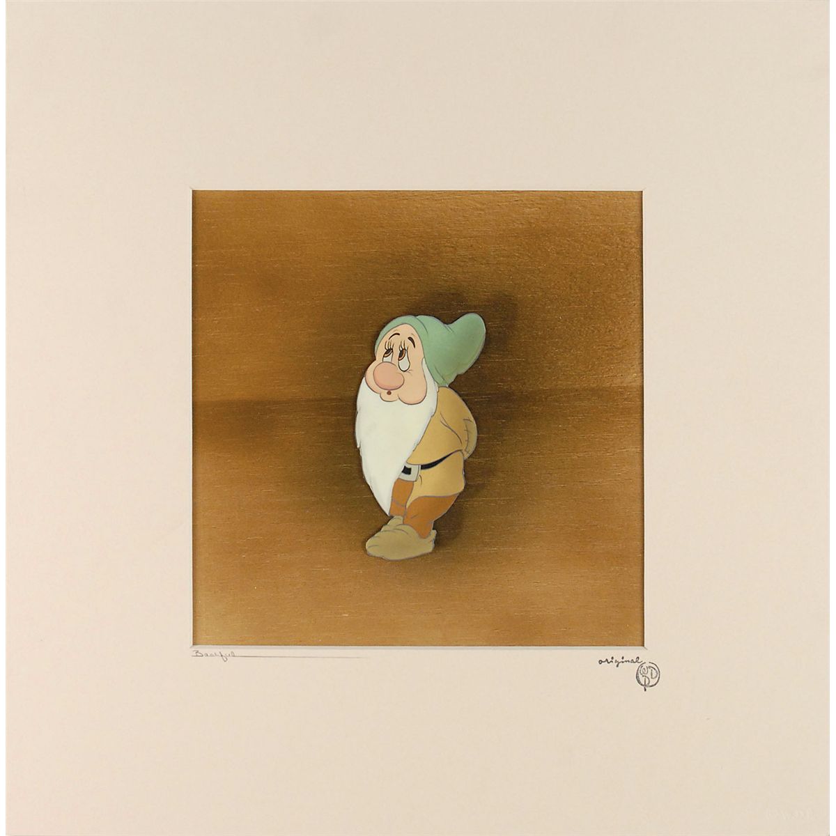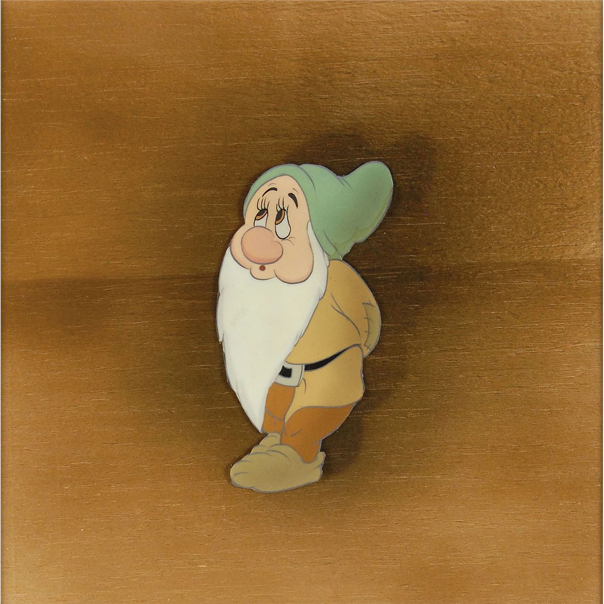 (Walt Disney Studios, 1937) Original production cel featuring Bashful from Snow White and the Seven Dwarfs. The cel has been trimmed and applied to a woodgrain background as prepared by the Disney Studio to be sold at the Courvoisier Galleries. Image measures 2 x 3.75, with a mat opening of 7 x 7. Acid-free mat dimensions are 13 x 13 and is notated in pencil, “Bashful,” with a WDP stamp. The piece has the original Disney Courvoisier Galleries label on the reverse. In fine condition.