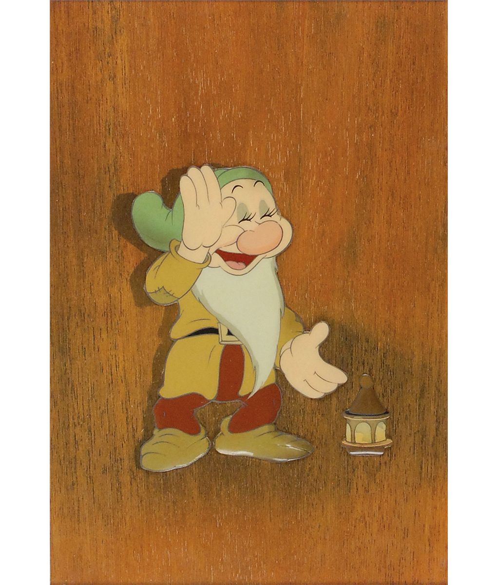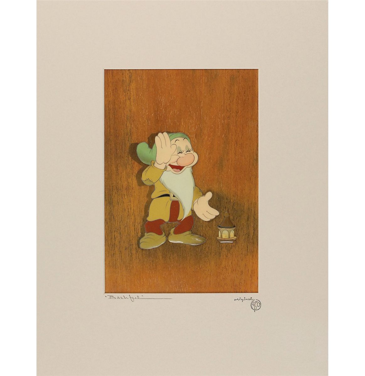 (Walt Disney Studios, 1937) Original production cel featuring Bashful from Snow White and the Seven Dwarfs, showing him gleefully clapping next to his lantern. The cel has been trimmed and applied to a woodgrain background as prepared by the Disney Studio to be sold at the Courvoisier Galleries. Image measures 3.25 x 4, with a mat opening of 10.5 x 13.5. The piece has the original Disney Courvoisier Galleries label on the reverse. In fine condition.
