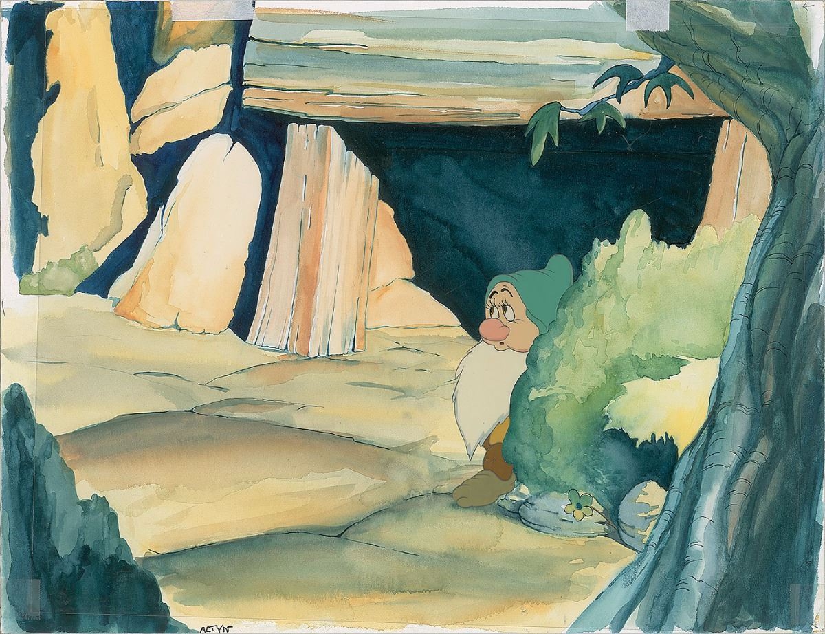 (Walt Disney Studios, 1937) Original production cel featuring Bashful from Snow White and the Seven Dwarfs, showing the shy dwarf peaking out from behind a shrub. The image cel is trimmed to 2.5 x 4.5 and placed on a second cel trimmed to 14 x 11; both have been placed on a hand-painted custom prepared background, with overall dimensions of 15 x 11.5. In fine condition.