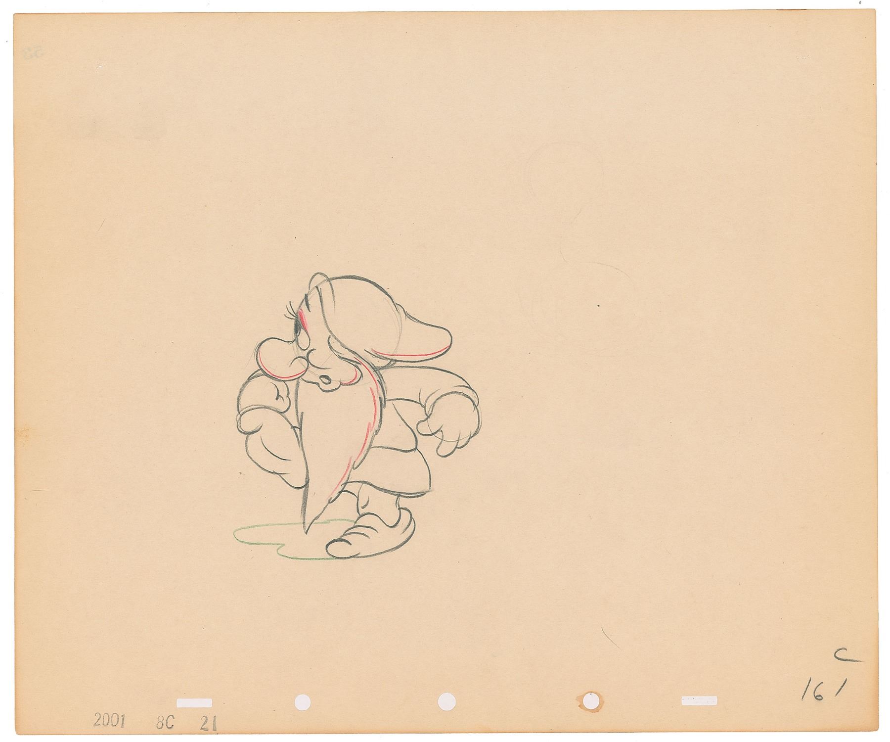 (Walt Disney Studios, 1937) Original production drawing featuring Bashful from Snow White and the Seven Dwarfs, showing the shy and cowardly dwarf in a full-figure profile pose. Accomplished in graphite and colored pencil on untrimmed 12 x 10 animation paper, which is marked "C161" and stamped "2001, 8C, 21." Image measures 3.5 x 4. In fine condition, with pinholes near the upper corners.