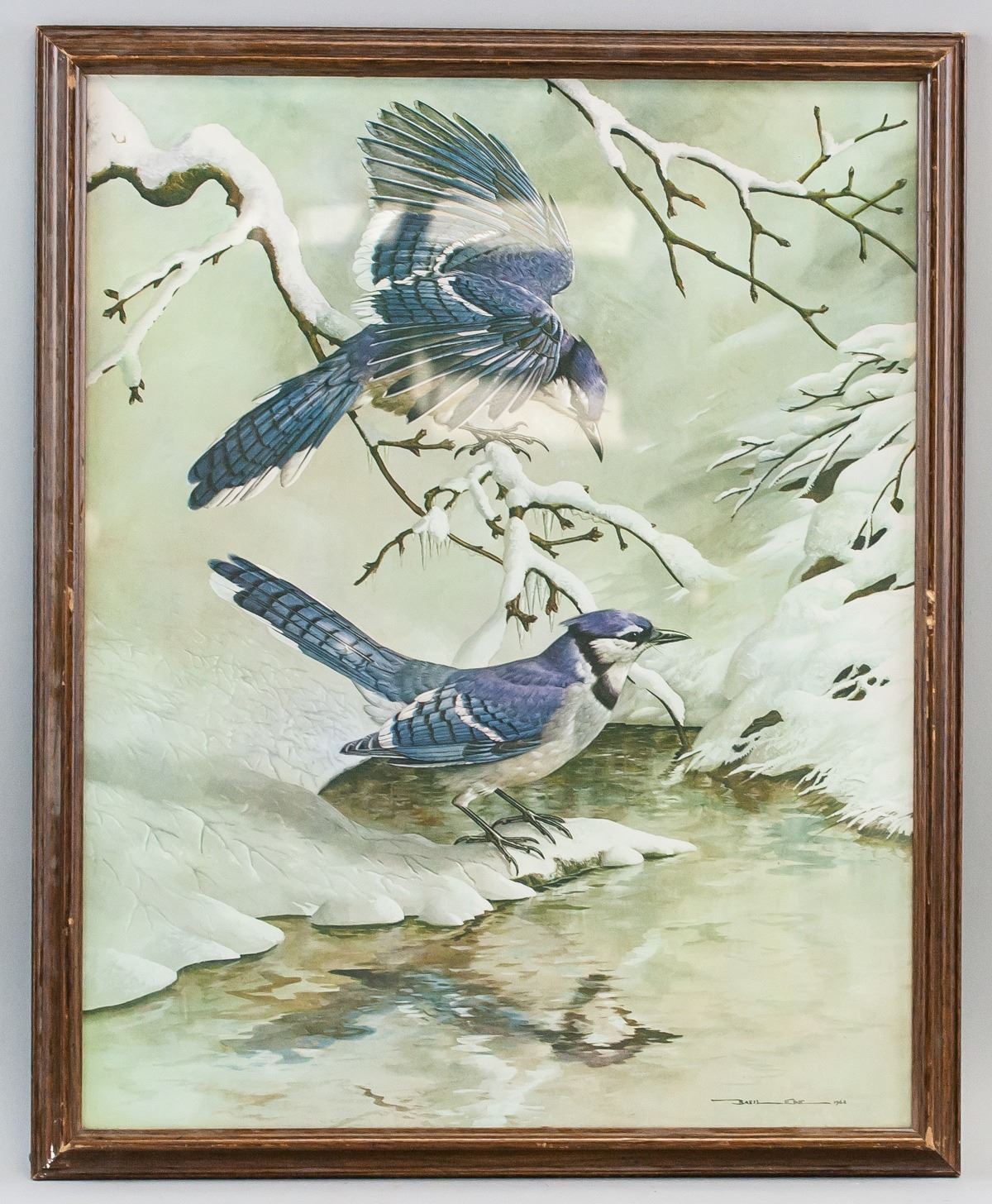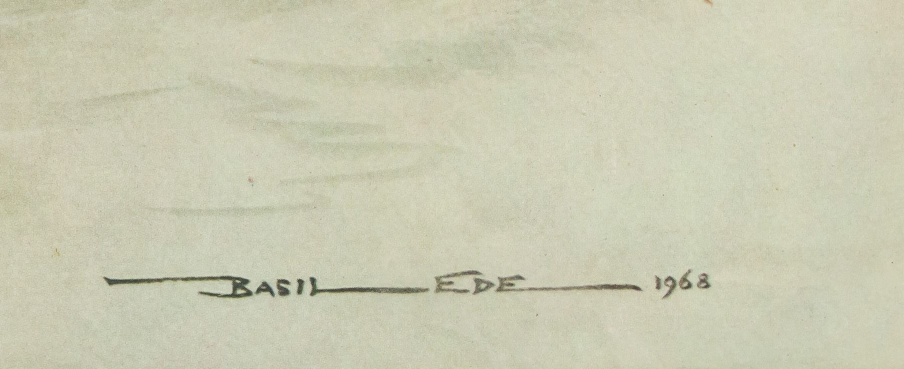 Print on paper, framed. Featuring two blue-plumed birds. "Basil Ede" printed in the bottom right corner with "1968" printed beside it. 50 x 40 cm (20 x 16.5 in)