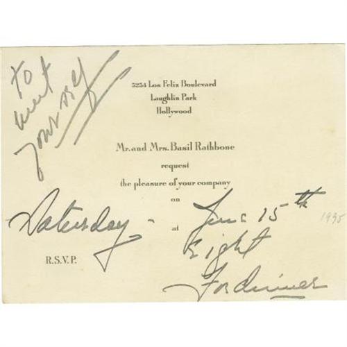 <B>Basil Rathbone Dinner Invitation.</B></I> A vintage dinner invite sent to "Mr. and Mrs. Basil Rathbone" circa 1935, with information written on it in black fountain ink in an unknown hand. In Very Fine to Excellent condition with mild tanning and wear. <I>Accompanied by LOA from PSA/DNA.</B></I><BR><BR><b>Shipping:</b> Flat Material, Small (<a target="_blank" href="http://www.heritageauctions.com/common/shipping.php">view shipping information</a>)