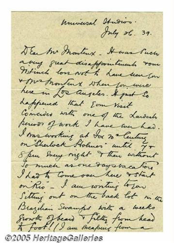 <B>Basil Rathbone Signed Letter.</B></I> Two-page, handwritten letter dated July 26, 1939, and addressed to conductor Pierre Monteux describing the long hours on the set of his first Sherlock Holmes film, "The Hound of the Baskervilles." In part: "I was working at Fox 20th Century on 'Sherlock Holmes' until 7 & 8 pm every night & then without so much as one days [sic] vacation I had to come over here & start on 'Rio' - I am writing to you sitting out on the back lot in the Brazilian Swamps with a weeks [sic] growth of beard & filthy from head to foot! (I am escaping from a Penal Colony to return to my wife who is in the arms of another man!). Rathbone played Holmes in 14 screen appearances, as well as on the radio from 1939-1946. The movies he mentions in this letter were two of the six films that he made in 1939. In fine condition with light tanning to the left and right margins on the first page. <I>With COA from PSA/DNA.</B></I>
