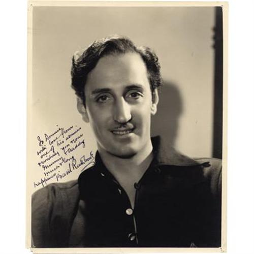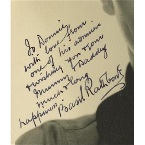 <B>Basil Rathbone Signed Photo to Donnie Dunagan.</B></I> A b&w 8" x 10" dashingly handsome headshot of Basil Rathbone, who forever won a hallowed place in vintage horror history via his flamboyant portrayal of the title role in Universal's 1939 classic <I>Son of Frankenstein.</B></I> Rathbone's class and kindness greatly impressed Donnie Dunagan, who played his onscreen son Peter, and the star inscribed, "To Donnie with love from one of his admirers & wishing you & your Mummy & Daddy much & long happiness," signing in black ink. The portrait is especially striking, with a swashbuckling quality (about a year before signing this, Rathbone had waged his classic sword duel with Errol Flynn in <I>The Adventures of Robin Hood</B></I>); it comes from the era when Rathbone reigned as the cinema's greatest villain -- and before he first played Sherlock Holmes. The portrait, and the film and co-player to which it relates, makes this a most desirable artifact from Golden Age Hollywood and Classic Horror. In Very Fine condition with mild age toning and mild wear and/or tack holes to the corners. <I>From the Donnie Dunagan Archive</B></I>.<BR><BR><b>Shipping:</b> Flat Material, Small (<a target="_blank" href="http://www.heritageauctions.com/common/shipping.php">view shipping information</a>)