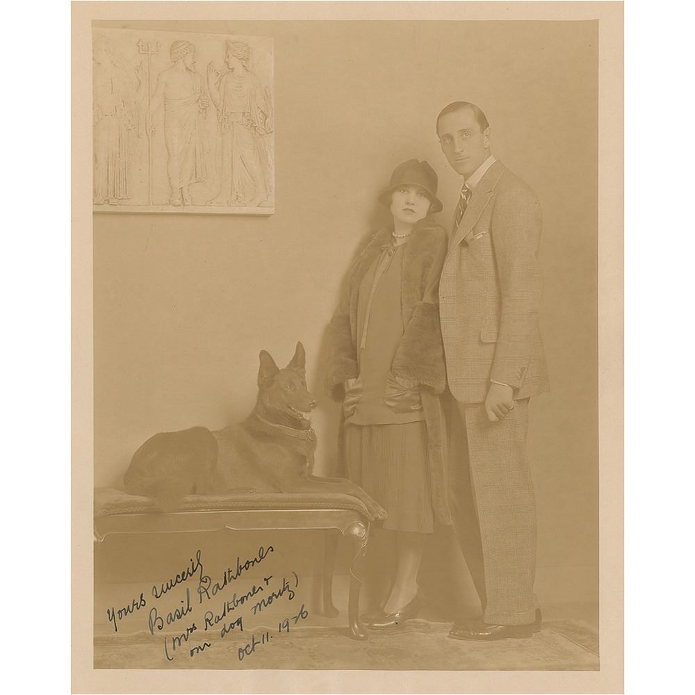 Vintage sepia matte-finish 8 x 10 full-length photo of Basil Rathbone posing with his second wife, Ouida Bergère, and their pet canine, signed in fountain pen, "Your sincerely, Basil Rathbone (Mrs. Rathbone & our dog Moritz) Oct. 11, 1926." Reverse bears a Wild World Studio stamp. In fine condition, with rippling to the top and bottom edges.