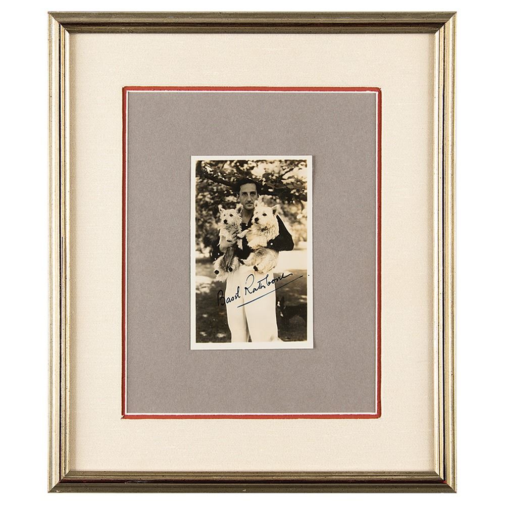 Vintage glossy 3.5 x 5.5 postcard photo of Rathbone holding his two show dogs, a beloved pair of West Highland white terriers, neatly signed in fountain pen, "Basil Rathbone." Handsomely mounted, double-matted, and framed to an overall size of 11.5 x 13.5. In fine condition, with light silvering to the darker areas of the image.
