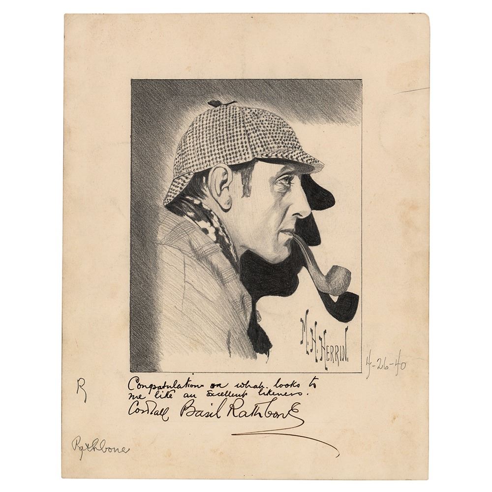 Original sketch of Rathbone in his enduring role as Sherlock Holmes, accomplished in pencil by M. H. Herrin on an off-white 9.25 x 11.75 cardstock sheet, boldly signed below in fountain pen. "Congratulations on what looks to me like an excellent likeness. Cordially, Basil Rathbone." Dated in the margin in pencil, "4-26-40." In fine condition.