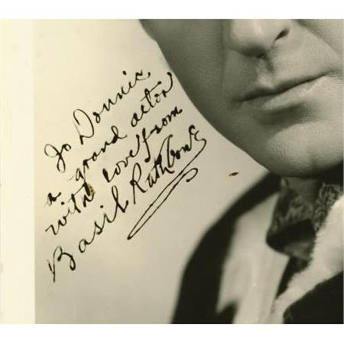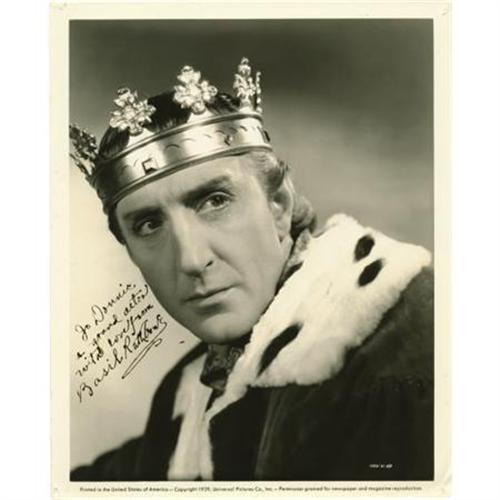 <B>Basil Rathbone Signed Photo from "Tower of London".</B></I> A stunning original 8 "x 10" portrait of Basil Rathbone as Richard III in Universal's <I>Tower of London</B></I> (1939), signed in black fountain ink to his co-player Donnie Dunagan, "To Donnie a grand actor with love from Basil Rathbone." Many believe Rathbone to have been the silver screen's greatest all-around villain (as well as its definitive Sherlock Holmes), and his sly, "crookback" Richard III was one of his most evil cinema scoundrels, played at the apex of Rathbone's Hollywood career. Rathbone and Dunagan, of course, had acted together previously in <I>Son of Frankenstein</B></I> and this portrait's warmly inscribed presentation shows the ongoing genuine affection that existed between the star and the child actor (then five years old). There are pinholes in each corner of the picture's border and a very slight smudge in the "h" in "with" in the inscription - otherwise it's in Excellent condition. It's hard to imagine a signed Rathbone picture that illustrates more vividly his magic as an actor and kindness as a gentleman. <I>From the Donnie Dunagan Archive.</B></I><BR><BR><b>Shipping:</b> Flat Material, Small (<a target="_blank" href="http://www.heritageauctions.com/common/shipping.php">view shipping information</a>)