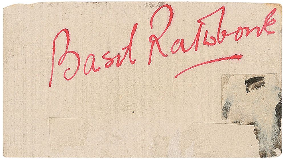 Red ink signatures, “Basil Rathbone” and “Nigel Bruce,” on individual off-white cards, respectively trimmed to 3.5 x 2 and 5.5 x 1.5. In overall fine condition, with scattered soiling and adhesive remnants to cards. Accompanied by an unsigned glossy photo of the pair.