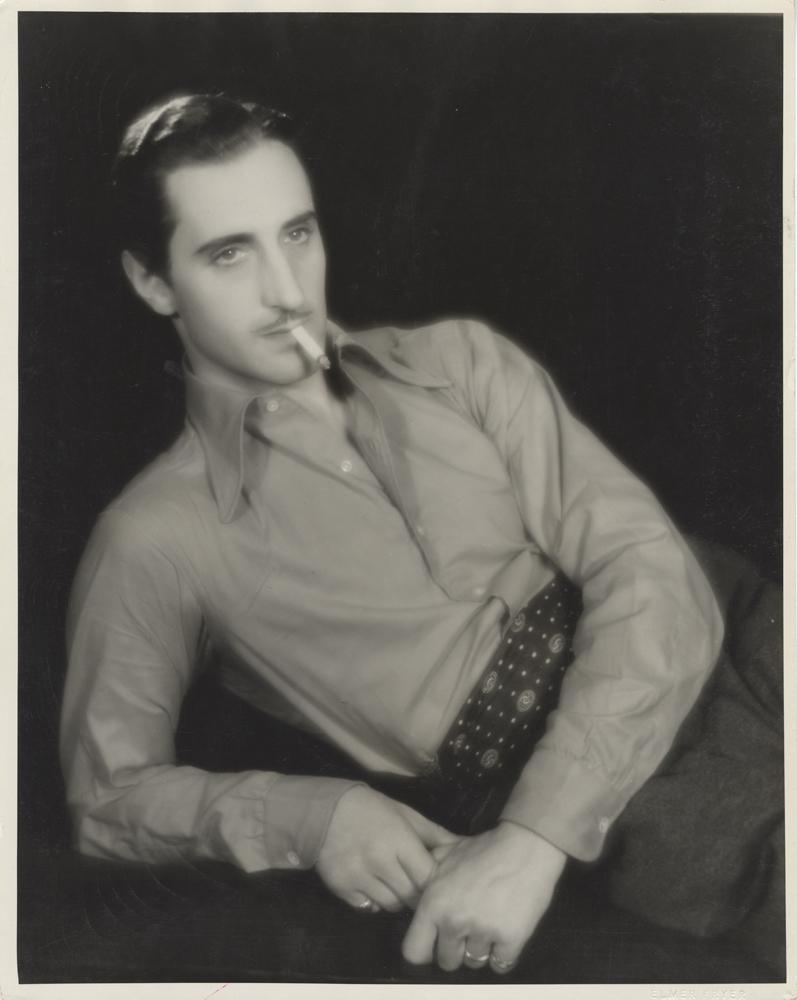 (First National, 1930) Gelatin silver glossy double-weight 11 x 14 in. print of Basil Rathbone from The Flirting Widow by Elmer Fryer; with blind embossed stamp, photographer and First National rubber stamp on the verso. Very good; with impressions and the upper right, rippling at the upper edge and emulsion rings.