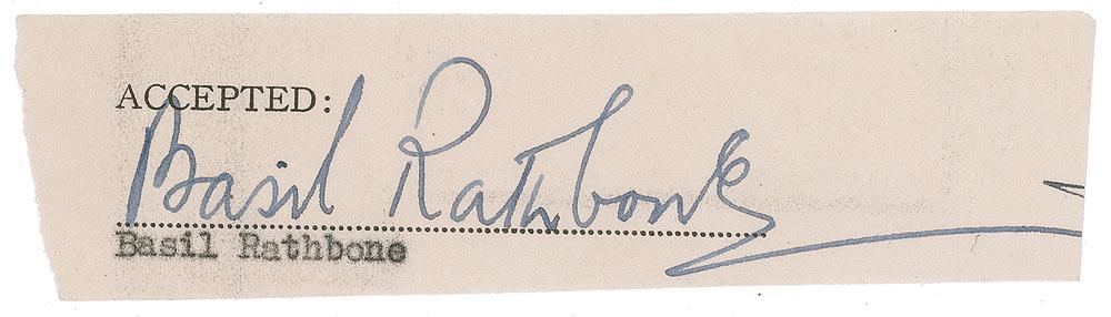 Vintage ink signature, “Basil Rathbone,” on an off-white 4.25 x 1.25 slip clipped from a larger document. In fine condition, with a rough left edge and a bit of trivial soiling from carbon.