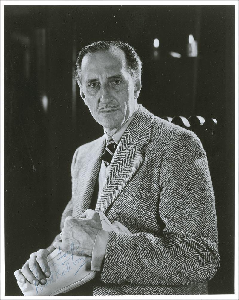 Vintage glossy 7.75 x 9.75 photo, signed and inscribed in blue ballpoint “To Vera Faull, Basil Rathbone.” A bit of trivial skipping to signature, a few light surface marks, and spotting to emulsion along left side, otherwise fine condition.