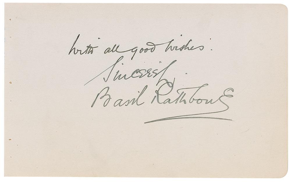 Large vintage fountain pen signature and sentiment, “With all good wishes, Sincerely, Basil Rathbone,” on an off-white 7.75 x 4.75 album page. In fine condition.