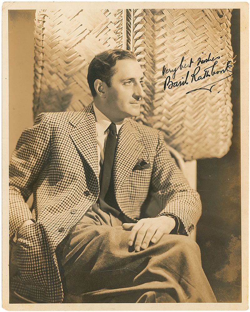 Debonair vintage sepia matte-finish 8 x 10 photo, signed in fountain pen, “Very best wishes, Basil Rathbone.” Some scattered light creases to image and borders, a bit of trivial silvering, and some light border soiling, otherwise fine condition.