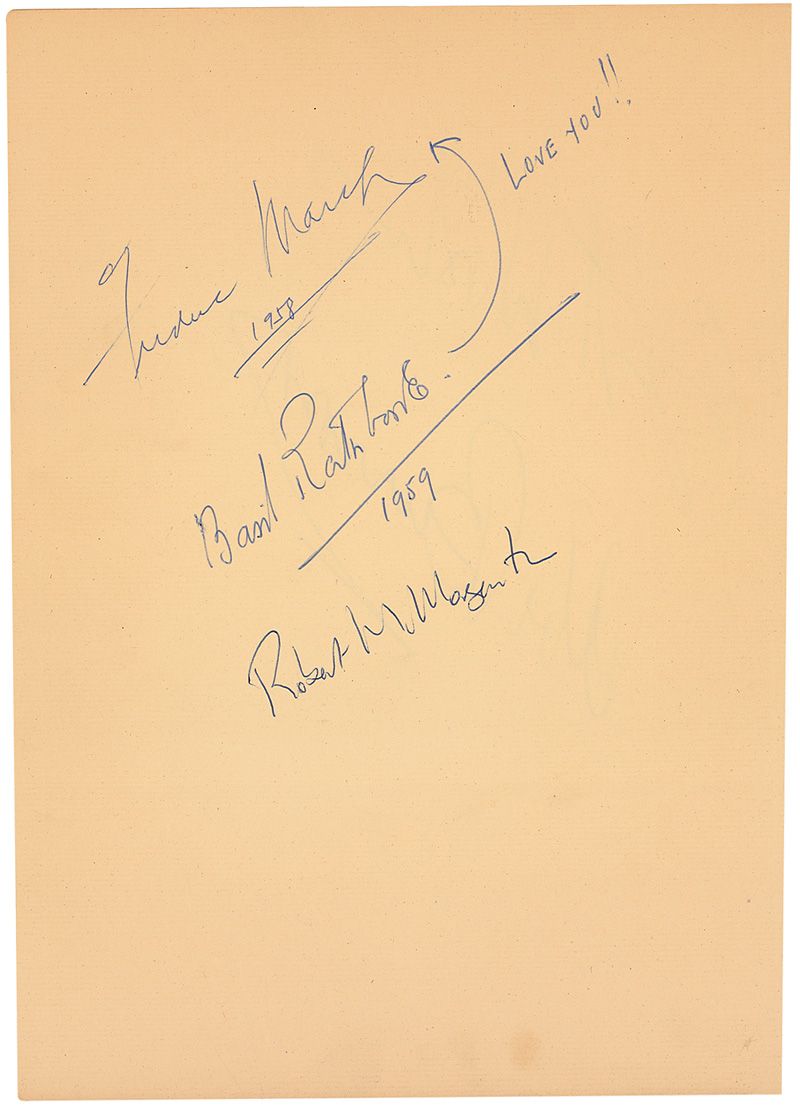Vintage ballpoint signature, “Basil Rathbone 1959,” on an off-white 7.75 x 11 guest book page, with a ballpoint signature of Fredric March above Rathbone’s, with Rathbone drawing an arrow from his name to March’s adding “Love you!!” In fine condition, with a barely noticeable hole to opening stroke of Rathbone’s signature.