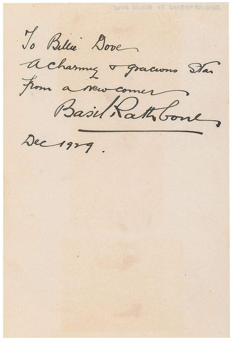 Vintage ink signature and inscription, “To Billie Dove, a charming & gracious star from a newcomer, Basil Rathbone, Dec. 1929,” on an off-white 3.75 x 5.5 sheet. In fine condition, with light scattered toning and some show-through from mounting remnants to reverse.