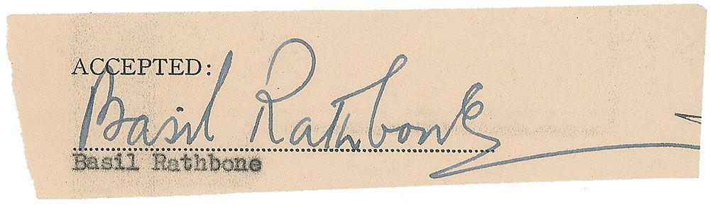 Vintage ink signature, “Basil Rathbone,” on an off-white 4.25 x 1 slip clipped from the closing of a document. In fine condition.