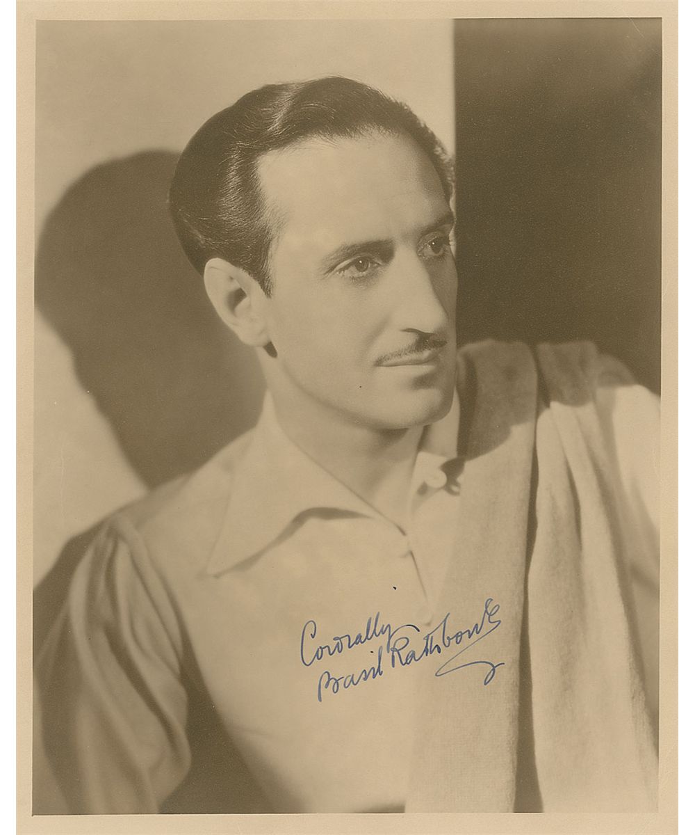 Dashing vintage sepia matte-finish 8 x 10 photo of Rathbone, nicely signed against his light shirt in fountain pen, “Cordially, Basil Rathbone.” In fine condition, with unobtrusive creases to the left side and upper right corner.
