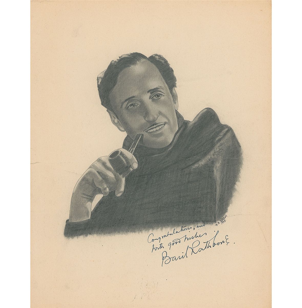 Oversized original vintage pencil portrait of Rathbone by D. A. Ahrens on an off-white 11 x 14 cardstock sheet, signed at the bottom in fountain pen, “Congratulations, and with good wishes, Basil Rathbone.” Also signed by the artist in black ink, and dated 1944. In very good condition, with scattered creases and a small tear to the left border.