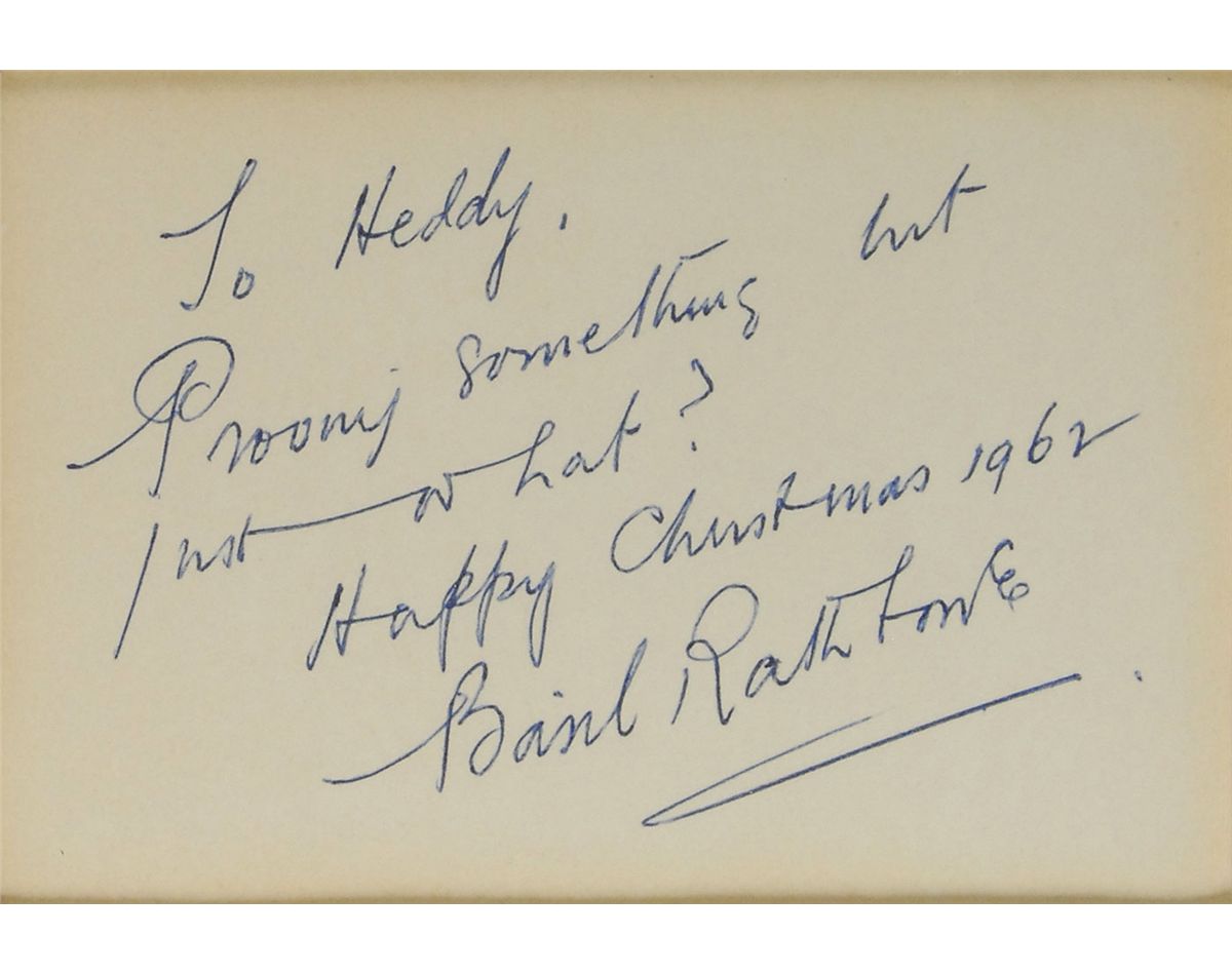 Ballpoint signature and inscription, “To Heddy, Proving something but just what? Happy Christmas 1962, Basil Rathbone,” on an off-white album page. Cloth-matted and framed with a photo of Rathbone as Sherlock Holmes to an overall size of 10.5 x 19. In fine condition, with a mild shade of toning.