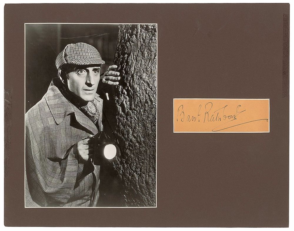 Fountain pen signature, "Basil Rathbone," on an off-white 4.5 x 1.5 album page. Matted with a glossy photo of Rathbone as Sherlock Holmes to an overall size of 14 x 11. In fine condition.