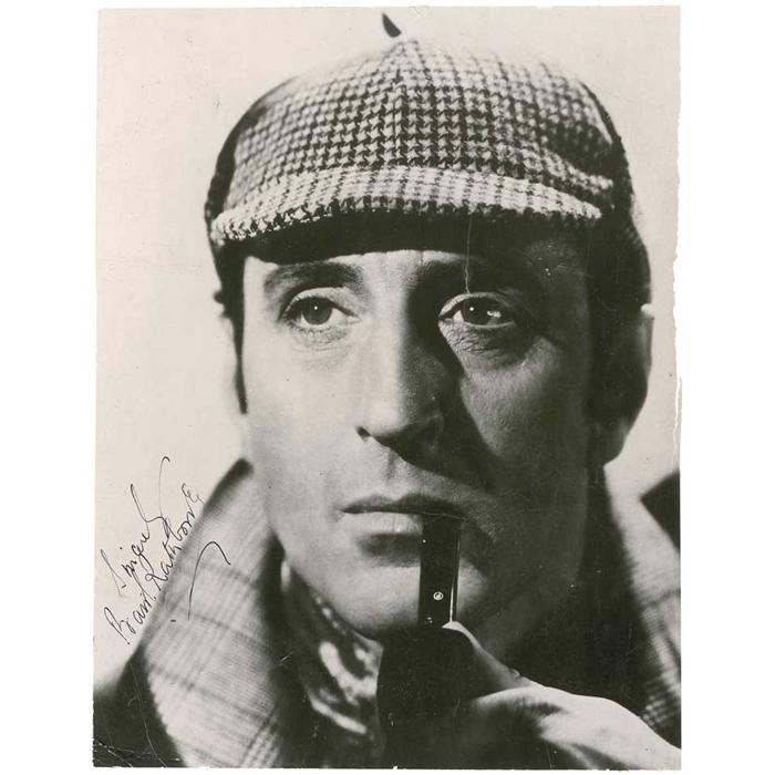Desirable vintage glossy 9 x 11.5 close-up photo of Rathbone as Sherlock Holmes, signed in fountain pen, “Sincerely, Basil Rathbone.” In good condition, with trimmed edges, several small edge tears, scattered creases to background and facial area, a few lightly affecting signature, and mounting remnants to reverse. Rathbone, while fairly obtainable in most forms, is strangely almost nonexistent in signed photos as Sherlock Holmes. Pre-certified PSA/DNA and RRAuction COA.