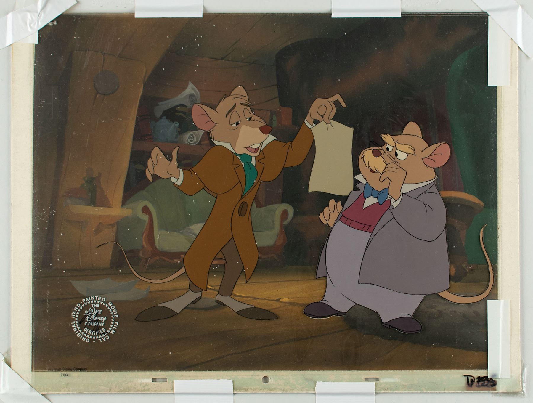 (Walt Disney Studios, 1986) Attractive original production cel and background featuring Basil and Dawson from The Great Mouse Detective, which shows the two crime-solving mice discussing business matters in Basil's apartment. The cels are laminated and placed on a hand-painted preliminary background from the same film. Character images measure 8.25 x 7.75 (Basil) and 6.25 x 7 (Dawson), with overall dimensions of 16.75 x 12.5. Double-matted to an overall size of 20 x 16. The piece has the silver Walt Disney Company seal to lower left. In fine condition. A wonderful set-up from a Disney film inspired by the tradition of Sherlock Holmes.
