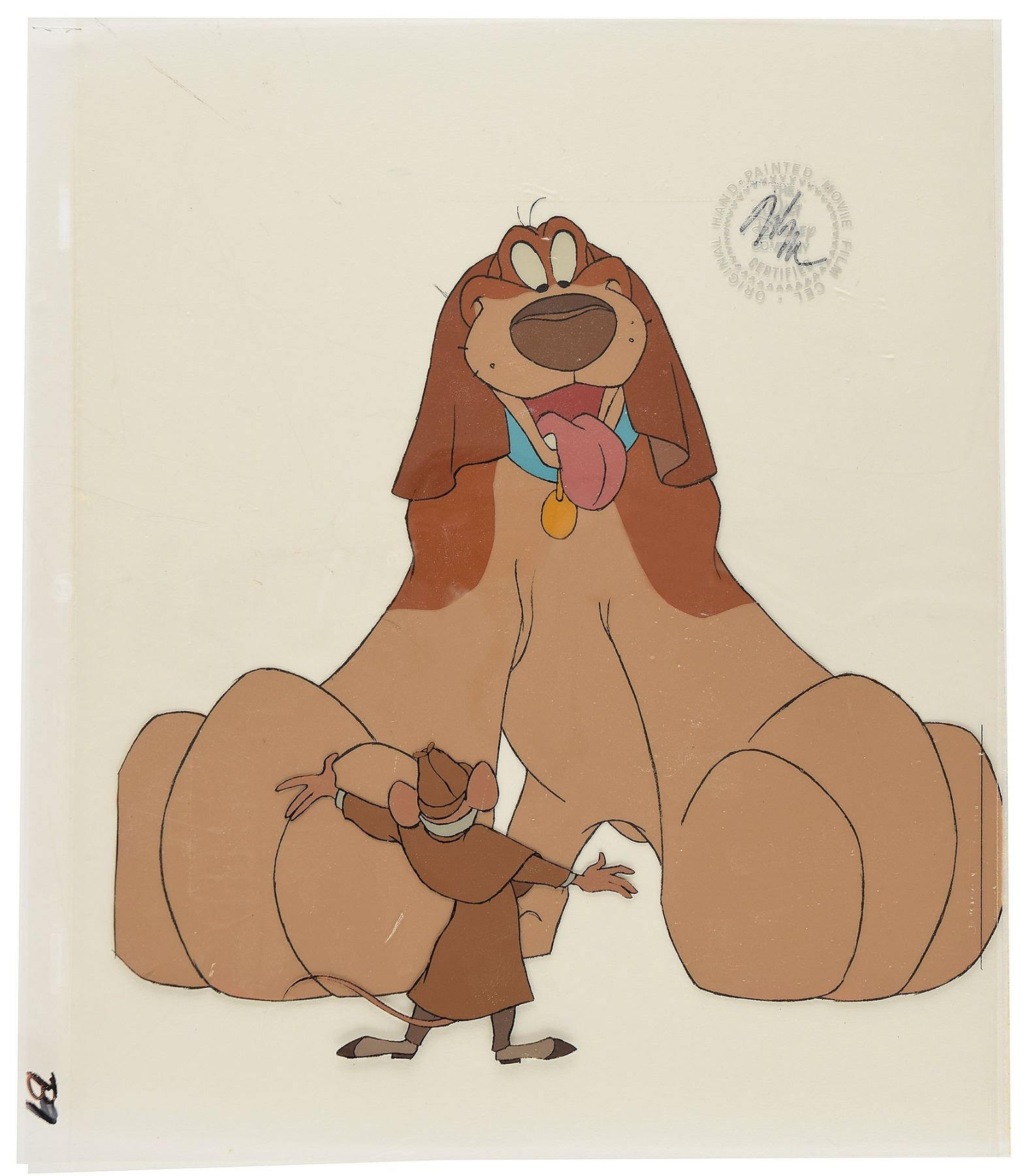 (Walt Disney Studios, 1986) Original production cel featuring Basil and Toby from The Great Mouse Detective, showing the mouse detective with his arms spread wide in front of his loyal basset hound. Basil measures 4 x 3.5 and Toby measures 9.5 x 8.75, with overall dimensions of 10.5 x 12.25. The piece has the silver Walt Disney Company seal to upper right. In fine condition, with trimmed edges