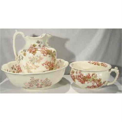 3 pieces. Made by Furnivals of Cobridge Staffordshire. Makers of earthenware. This set bears the registration mark "188048" which dates it to 1892-93. It has whita and tan flowers on a white background. The Wash Basin measures 5.1/8" tall and 15.1/2" across the top, the Ewer/Pitcher stands 12.1/2" to the top of the thumbrest and has a circumference of 27", the potty has a large chip to the rim and stands 5" tall and 9.1/4" across the top.