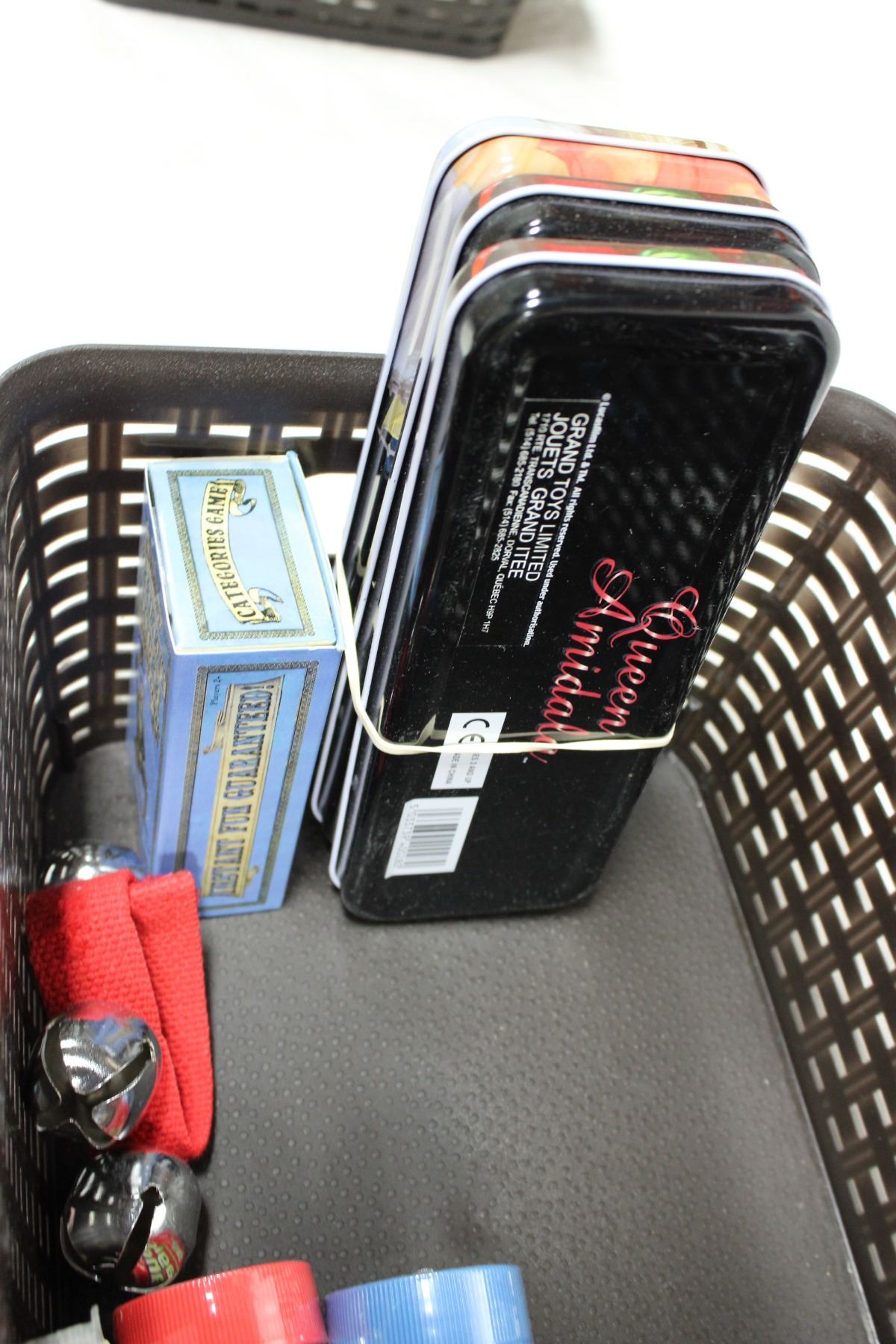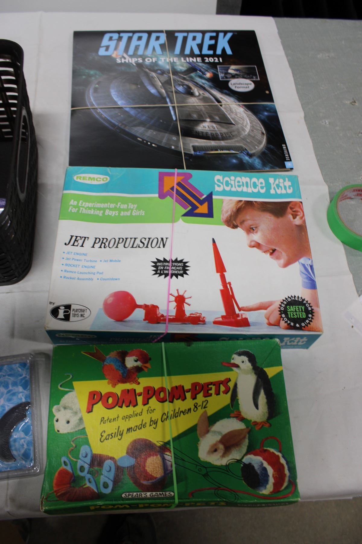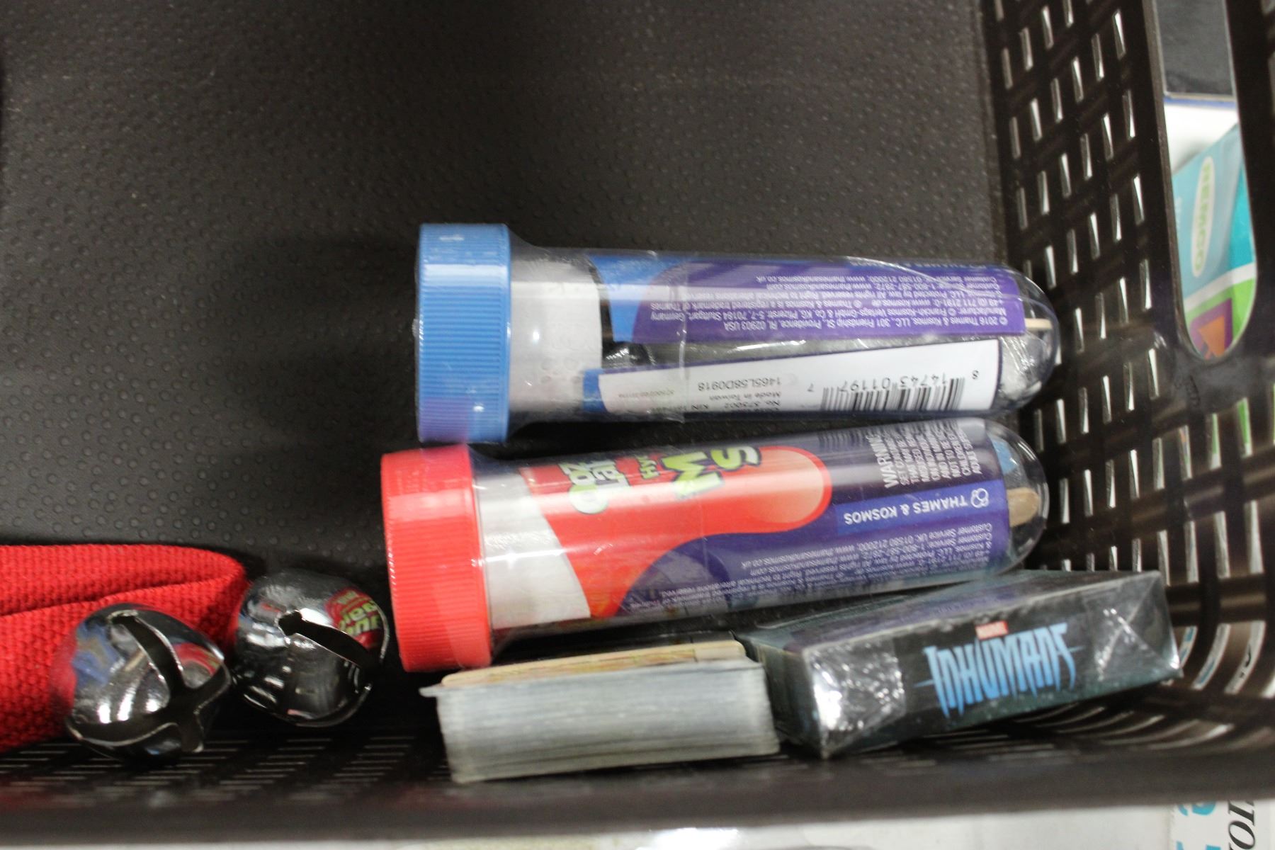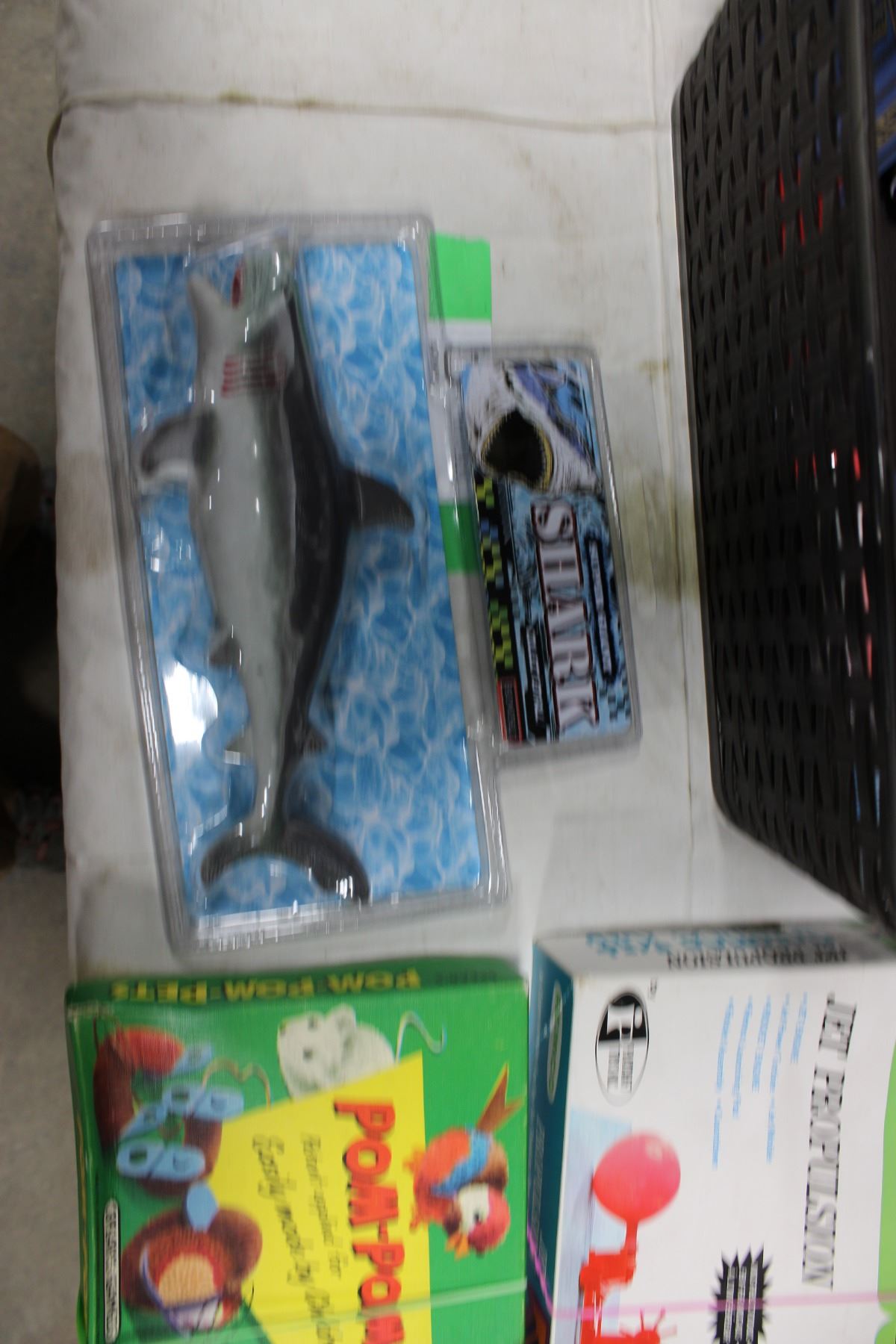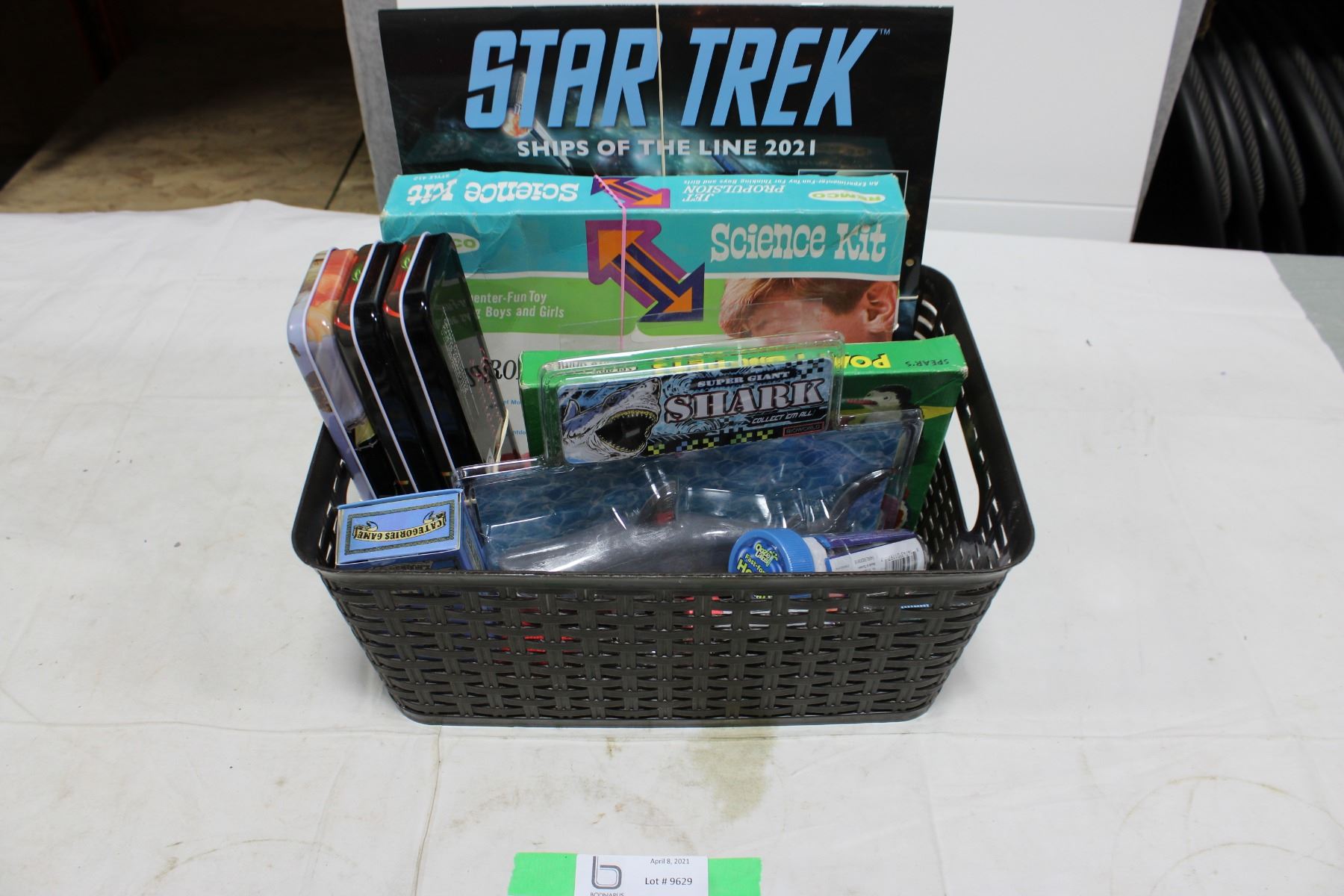 Basket Box Lot of New & Older Toys: Shark, Rocket Science Kit, Marvel Playing Cards, etc