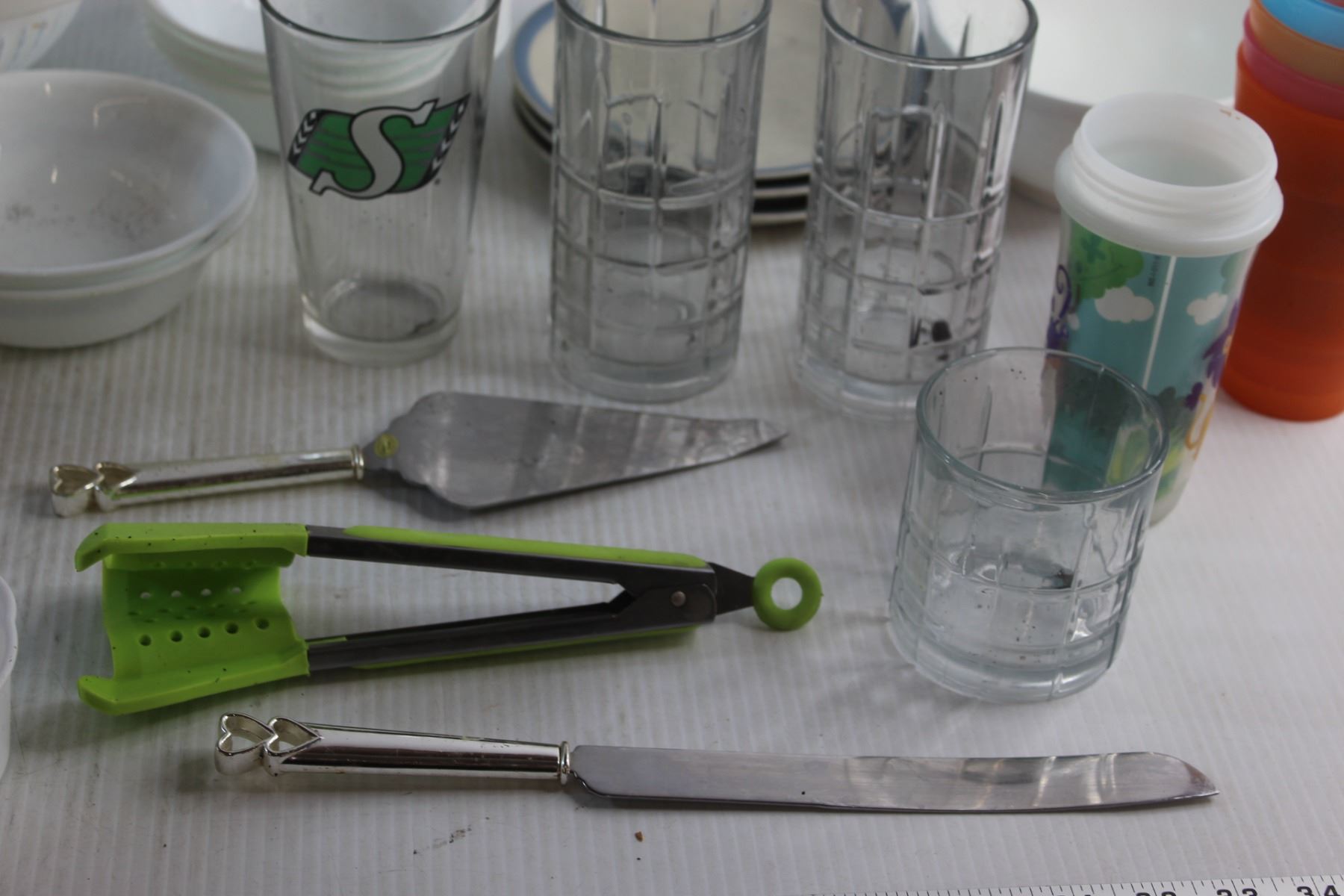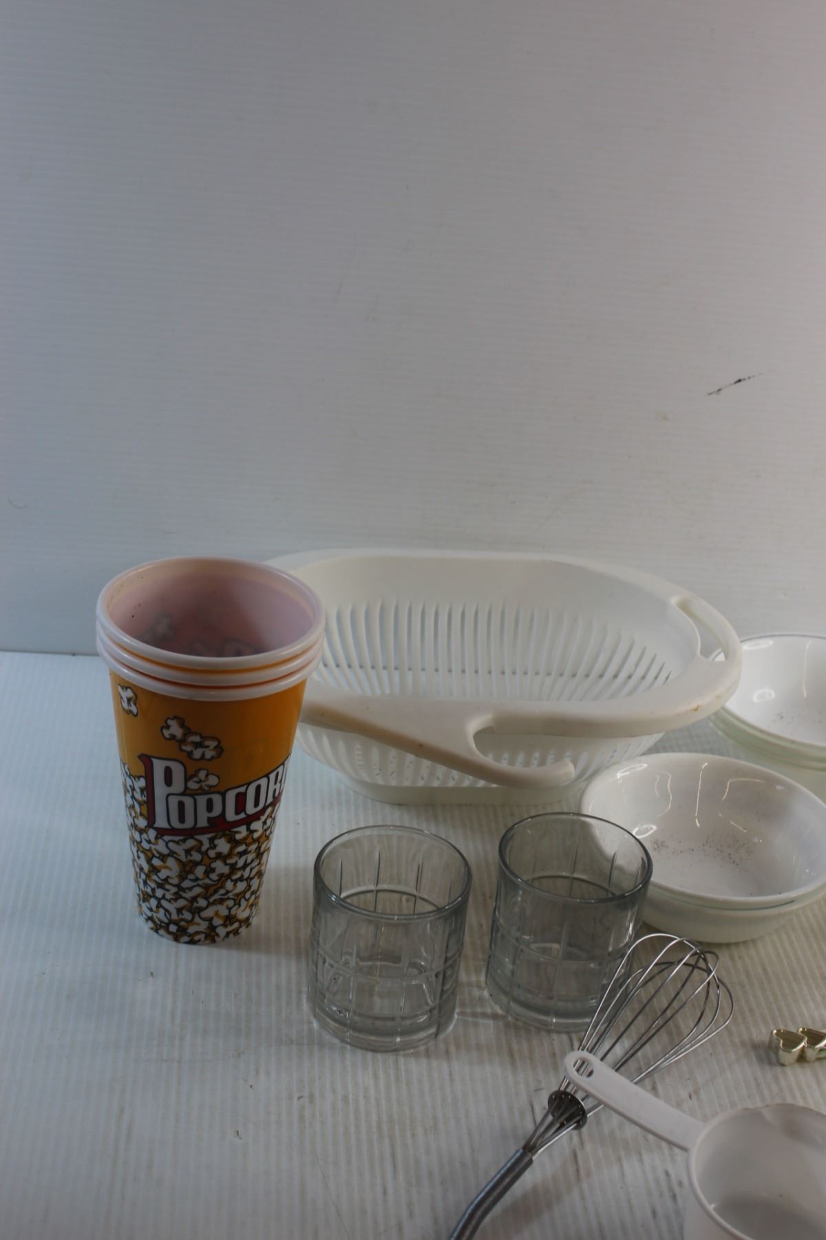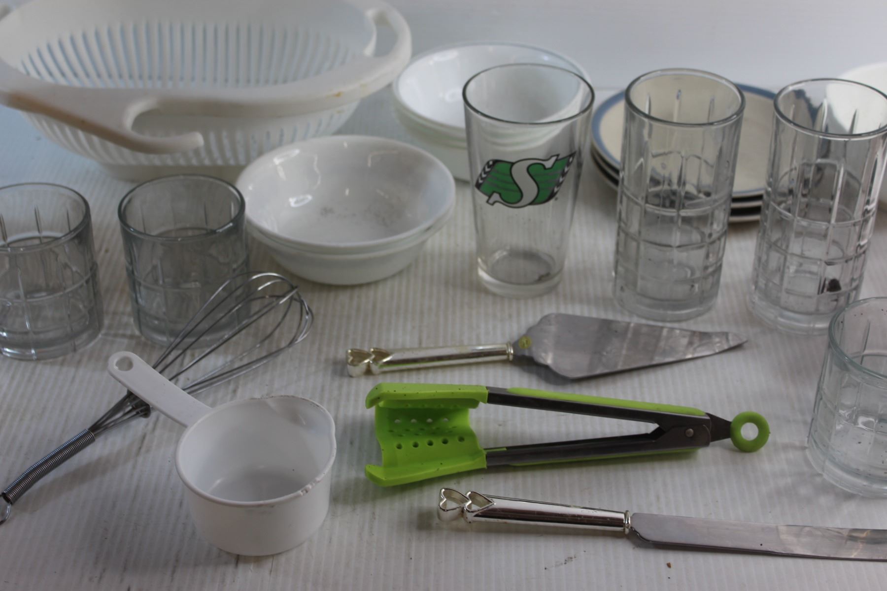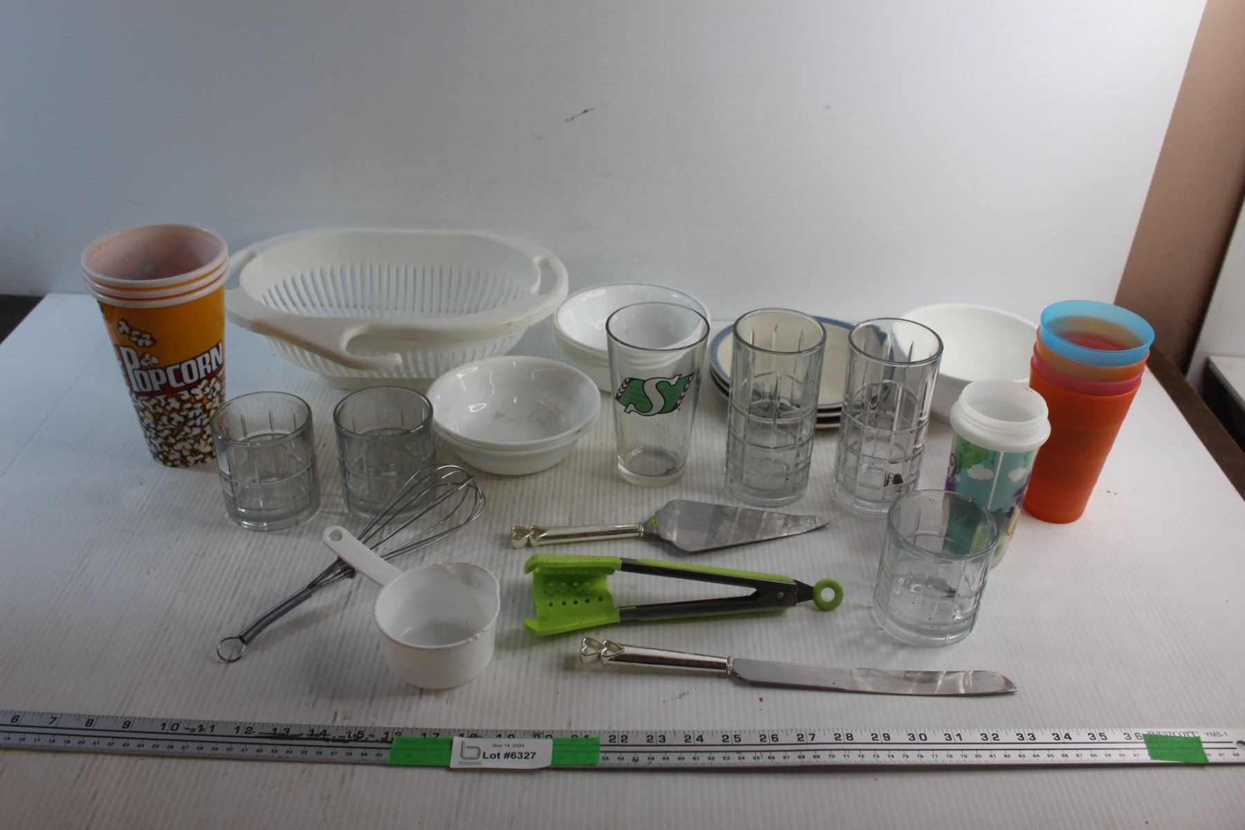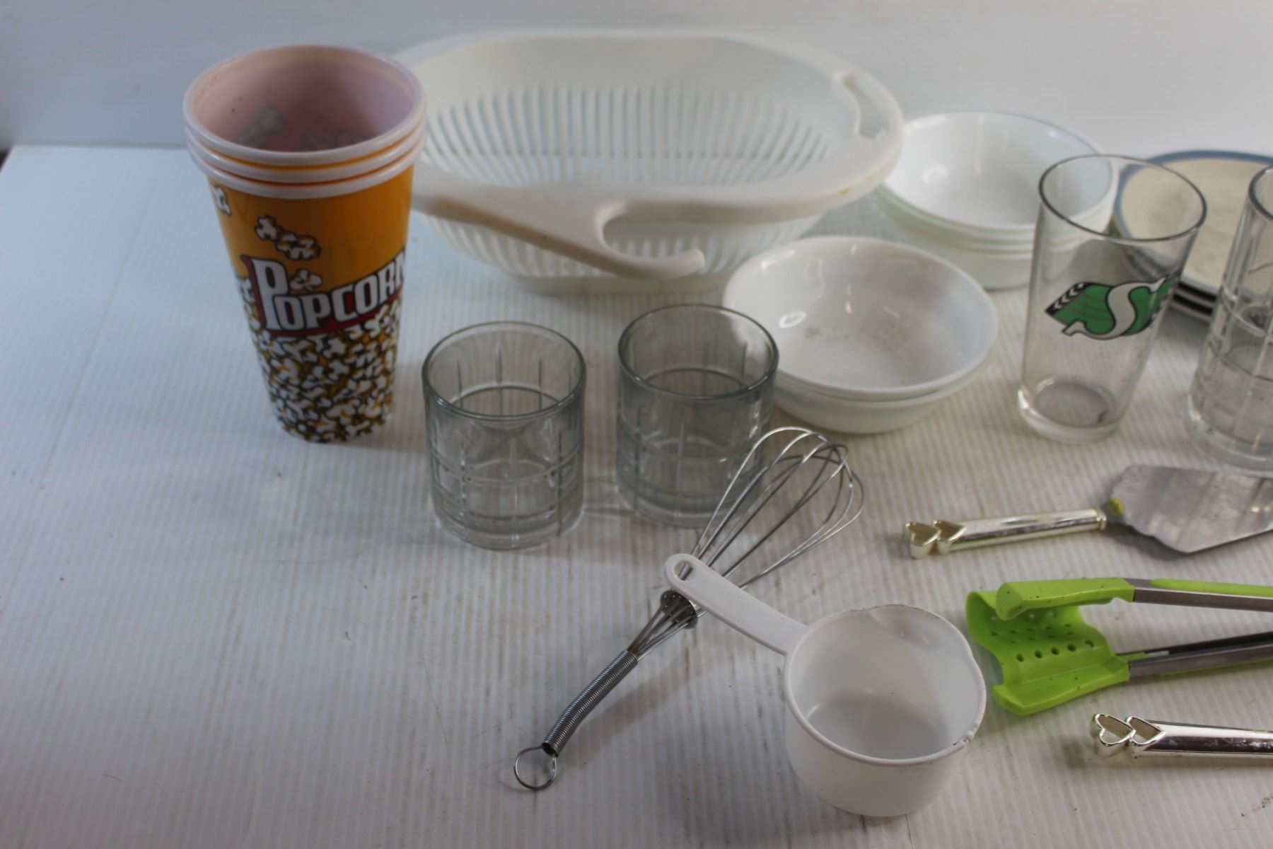 Basket Strainer, Whisk, Plates, Bowls, Cups, Tongs and a Measuring Cup