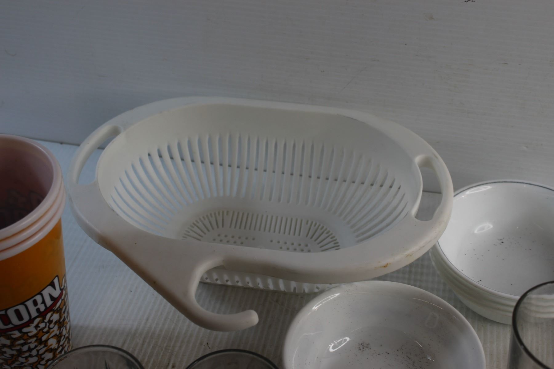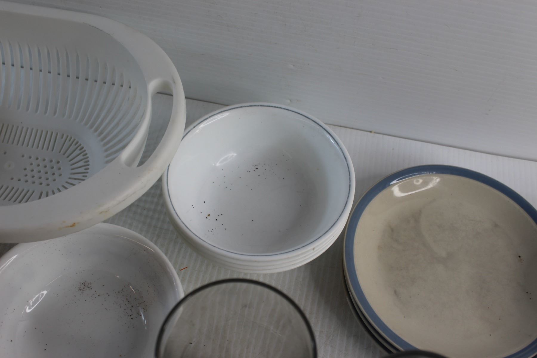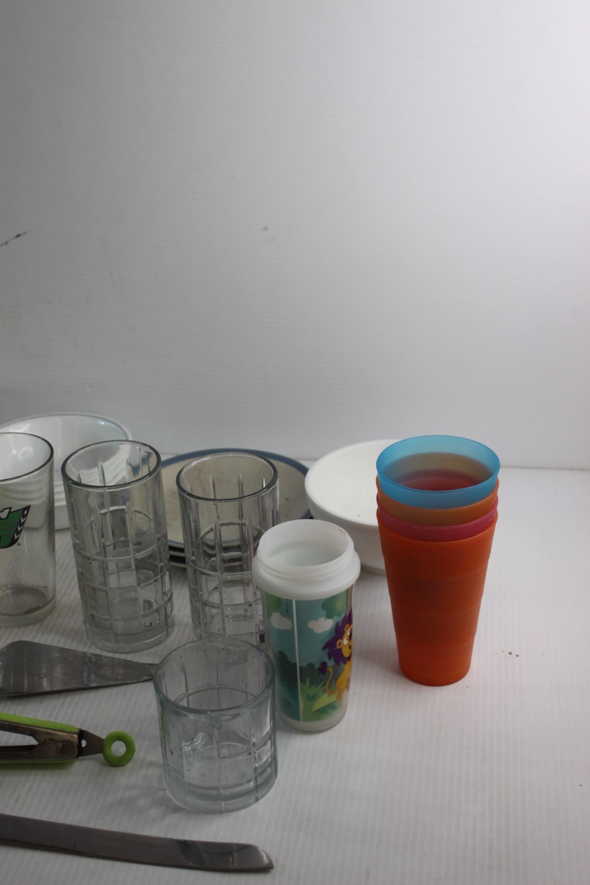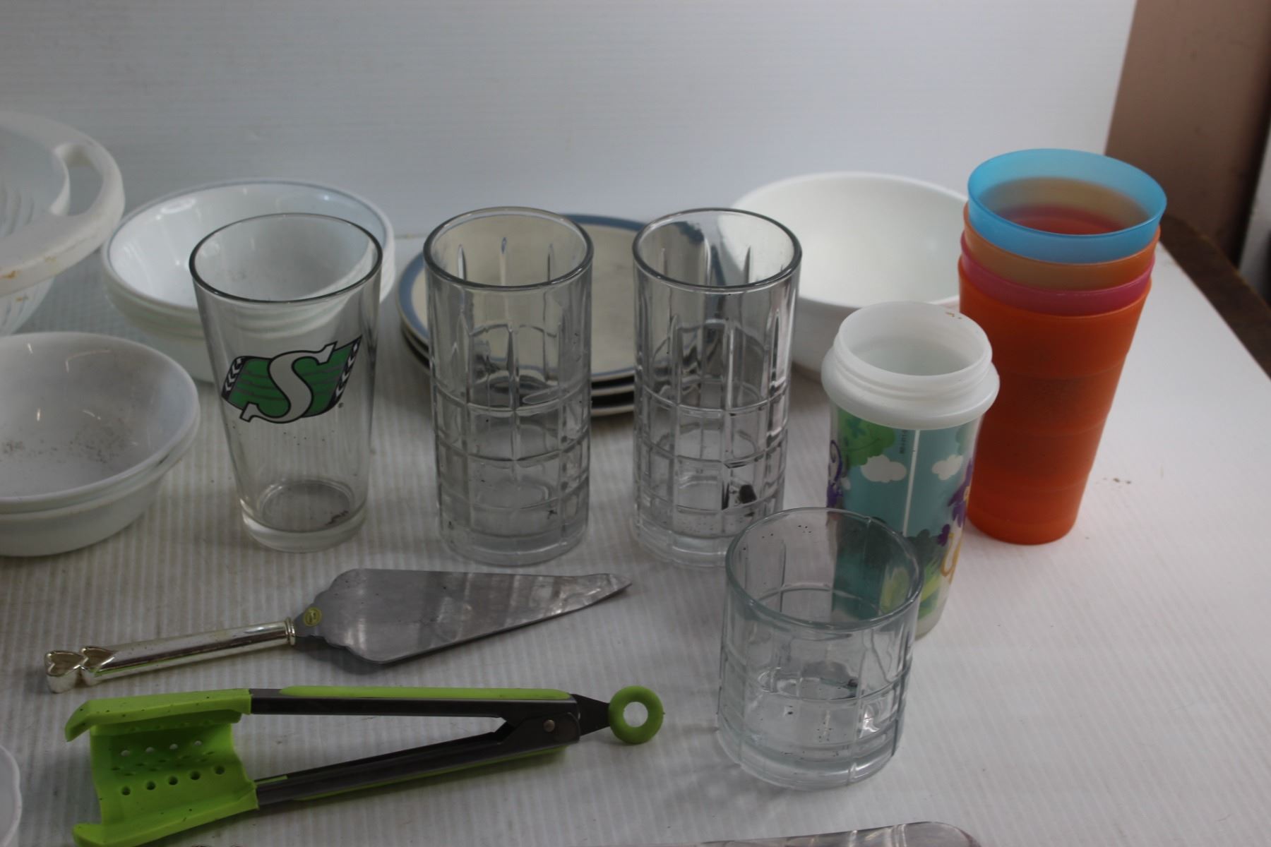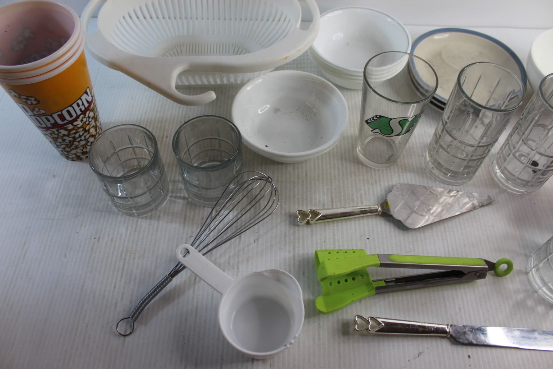 Basket Strainer, Whisk, Plates, Bowls, Cups, Tongs and a Measuring Cup