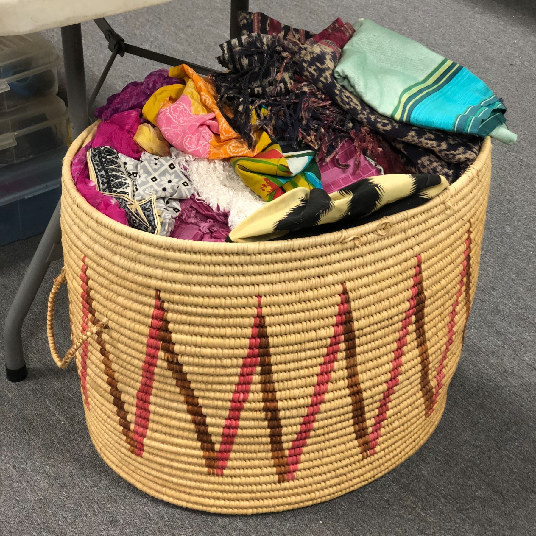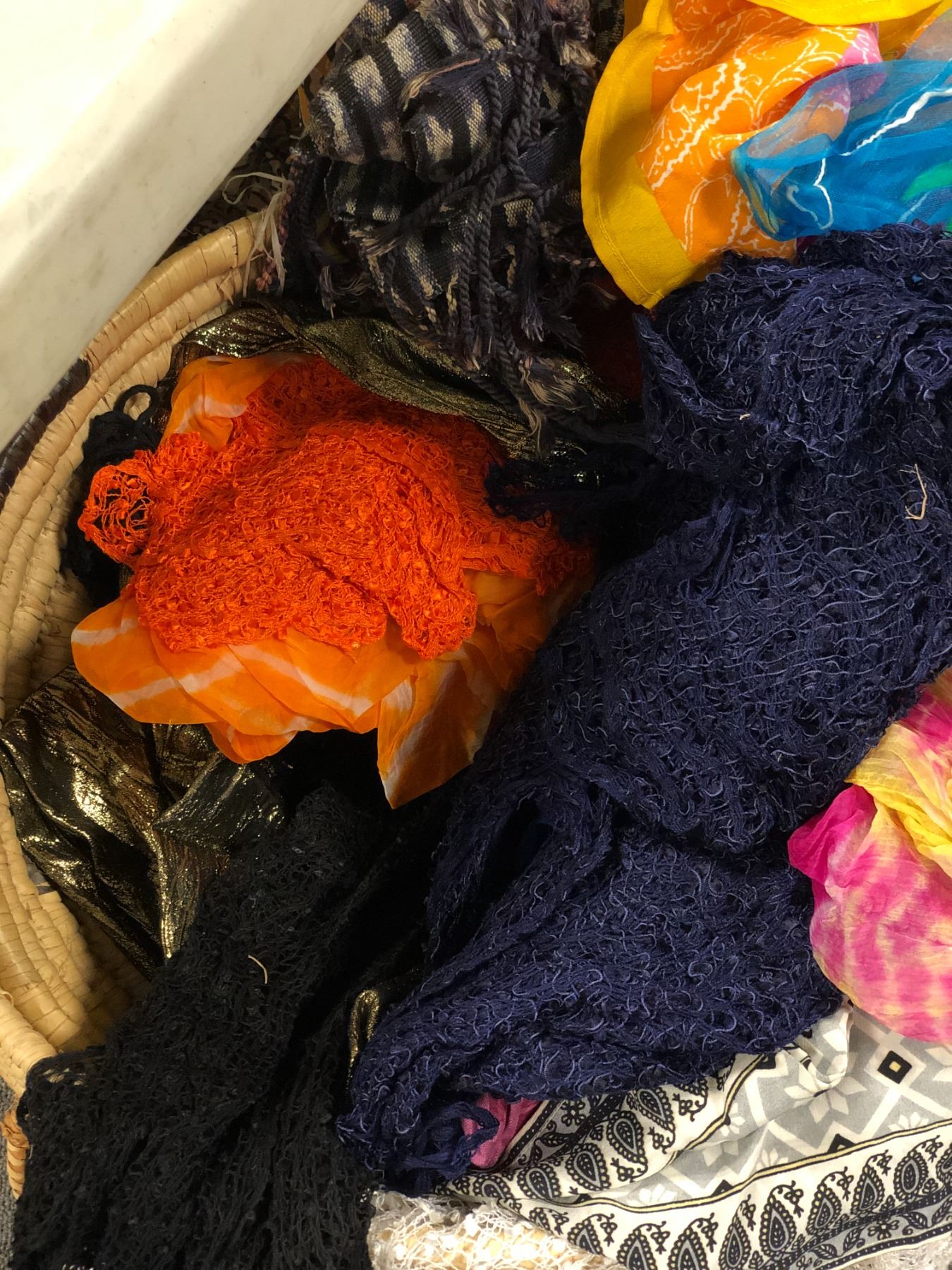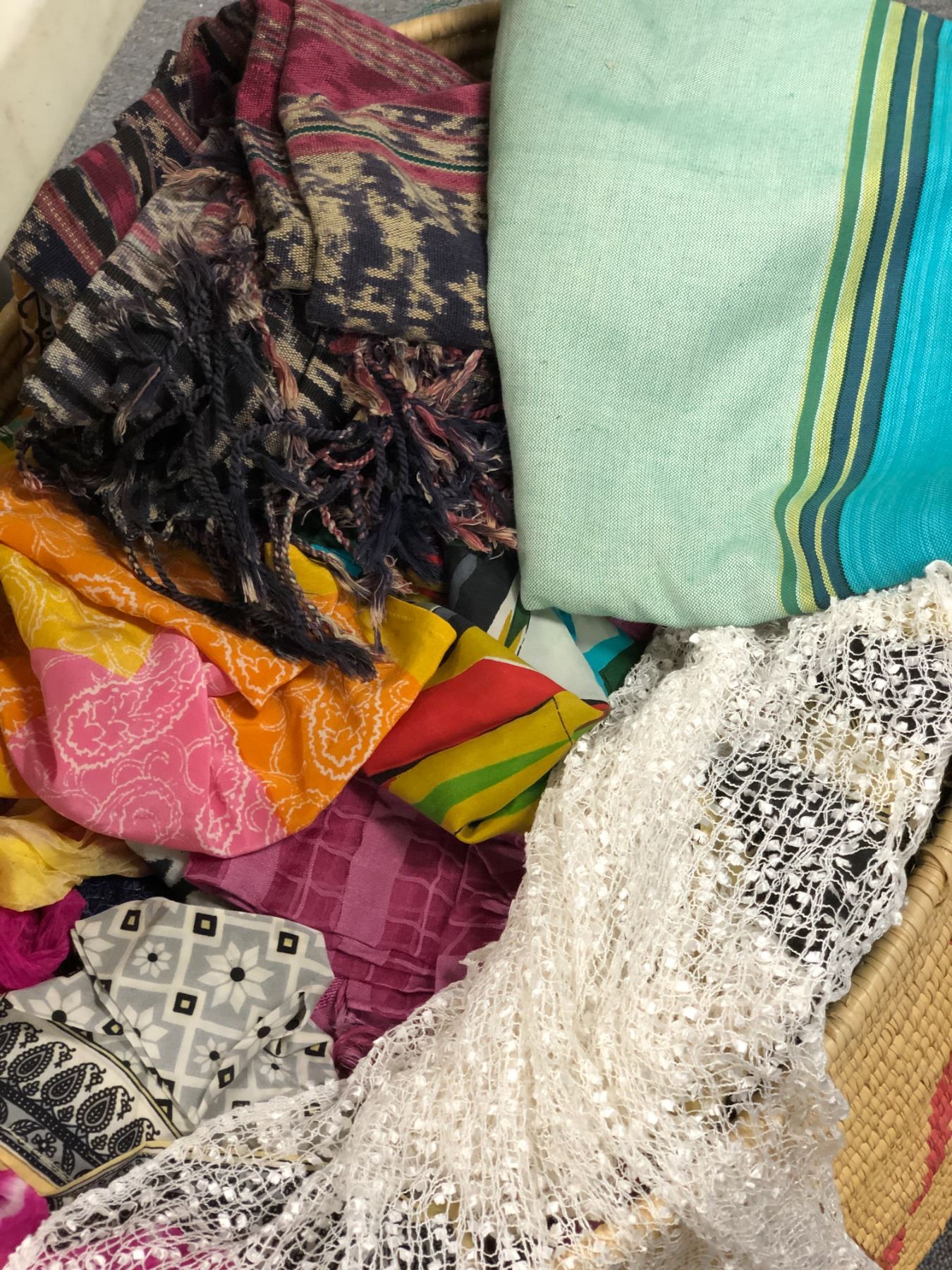 Basket filled w/ assorted African scarves / sheets / cloths / bedding etc
