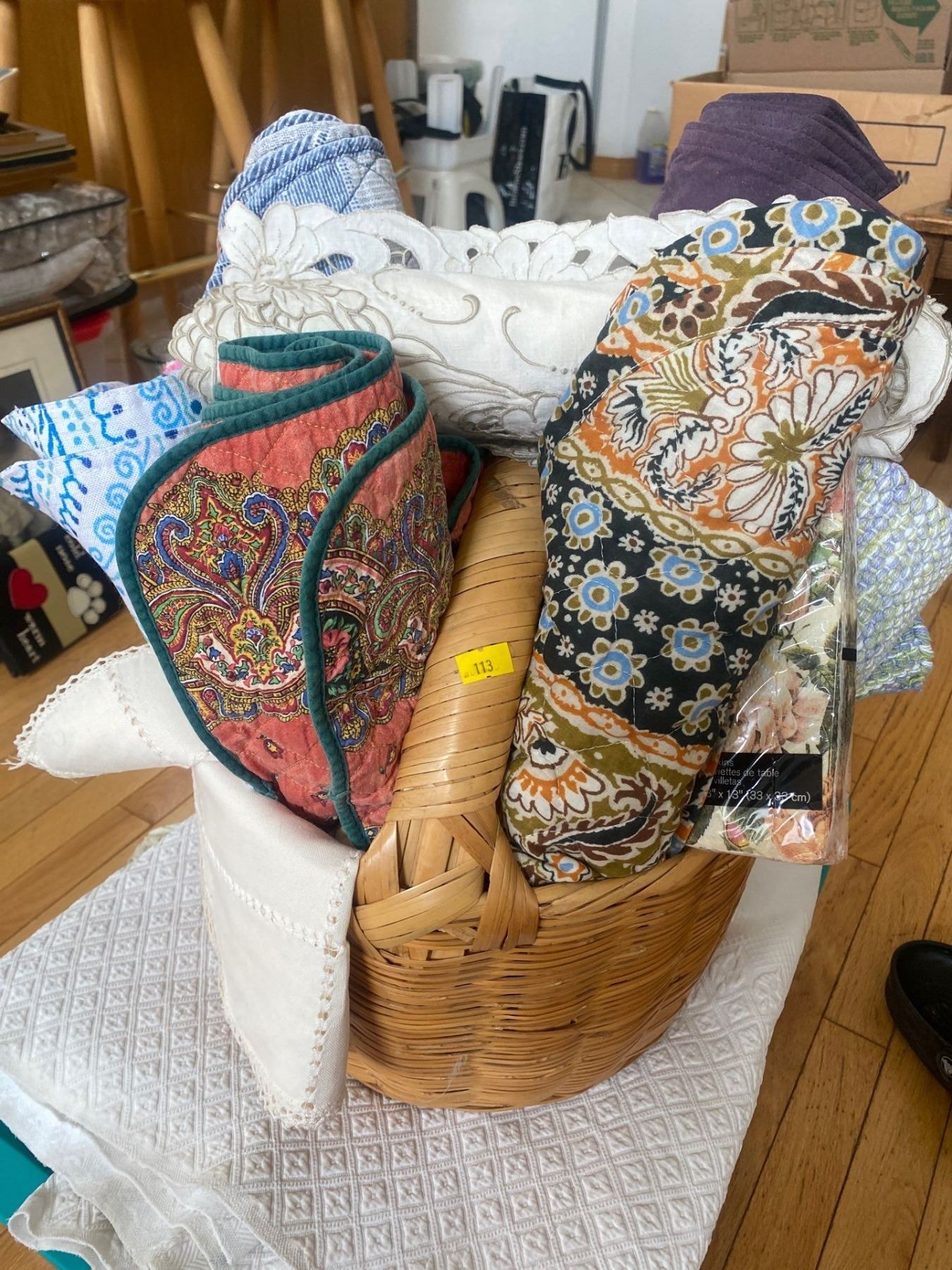 Basket of Beautiful Linens Made From Natural Fibers Alpaca Wool Blanket Hemp & More