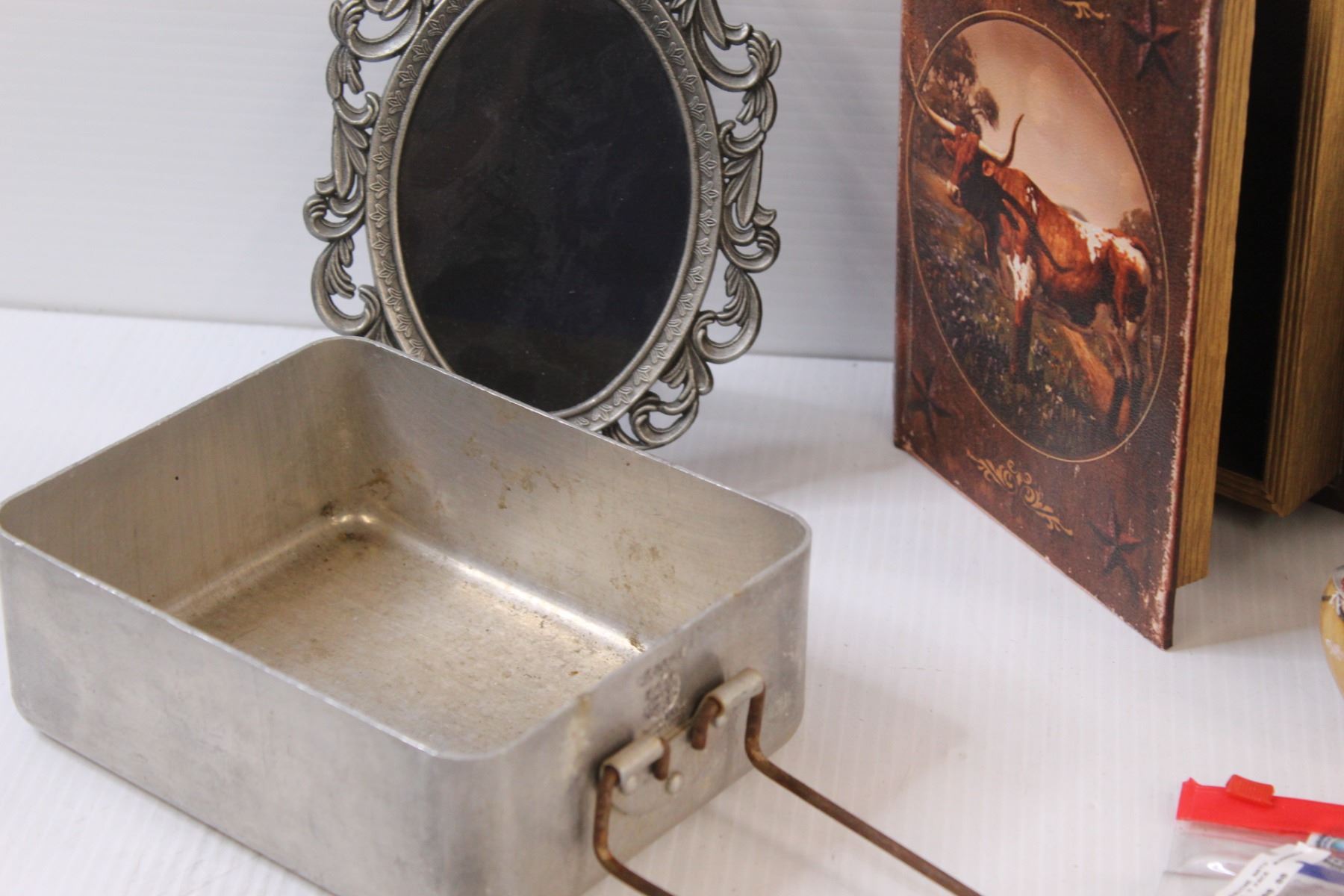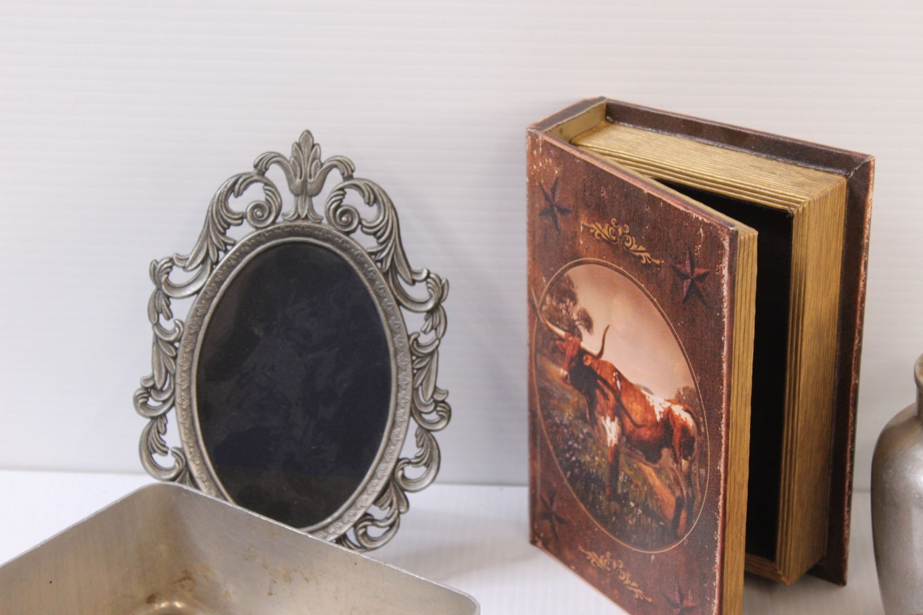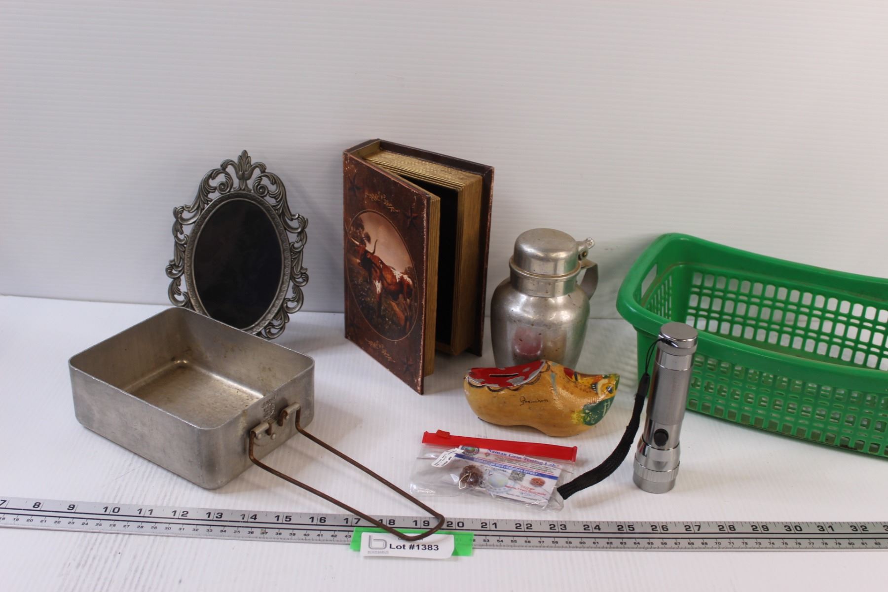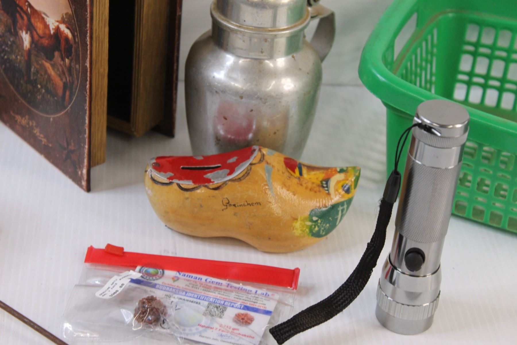 Basket of: Hidden Book, Ornate Picture Frame, Rudraksha, Dutch Clog Coin Bank, Misc.