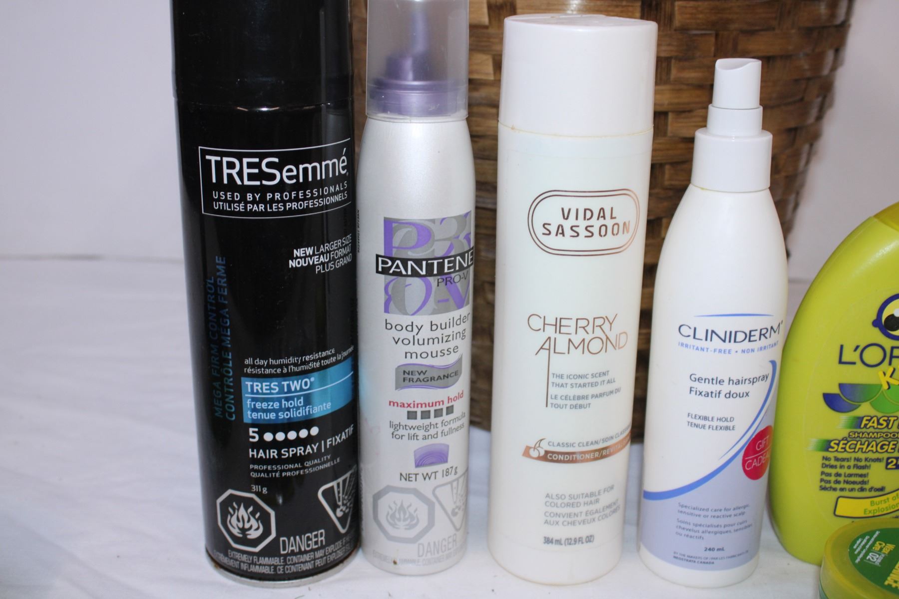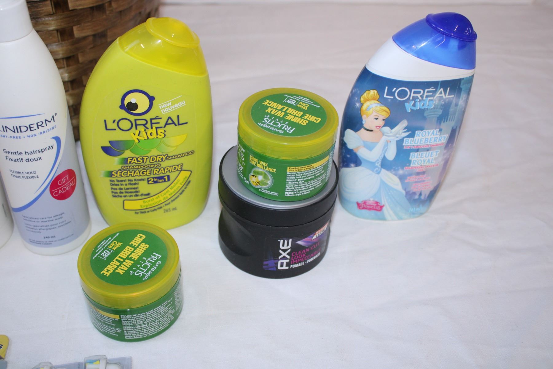 Basket with shampoo and various toiletries
