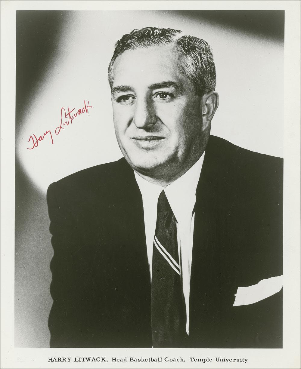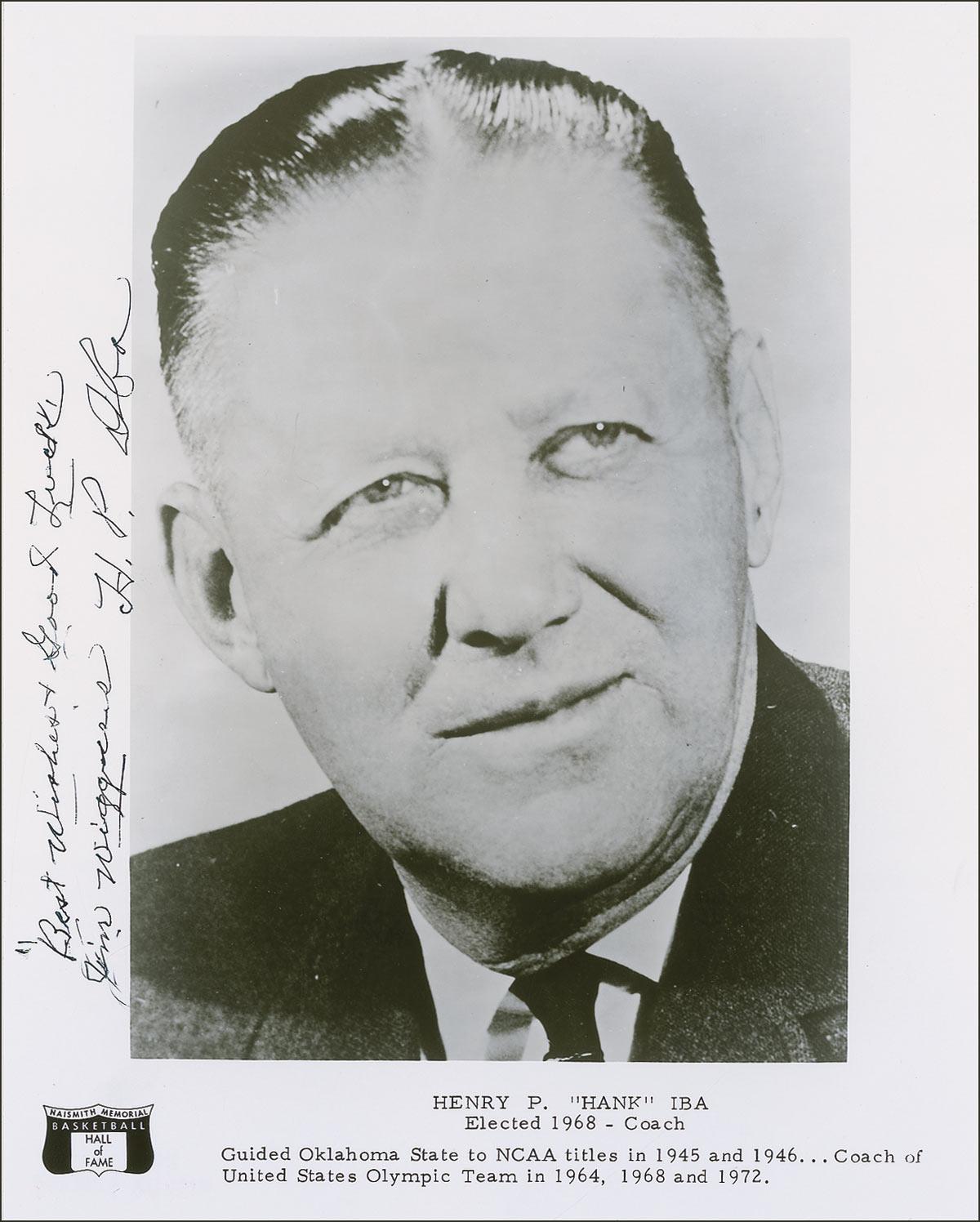 Three signed photos: two glossy photos of Henry Iba, one 8 x 10 and one 7.75 x 6, each signed in black ink (one inscribed); and a glossy 8 x 10 of Harry Litwack, signed in red felt tip. Trimmed edges and creases to one of Iba’s photos, some light ink adhesion to two of the signatures, and scattered surface marks, otherwise fine condition.