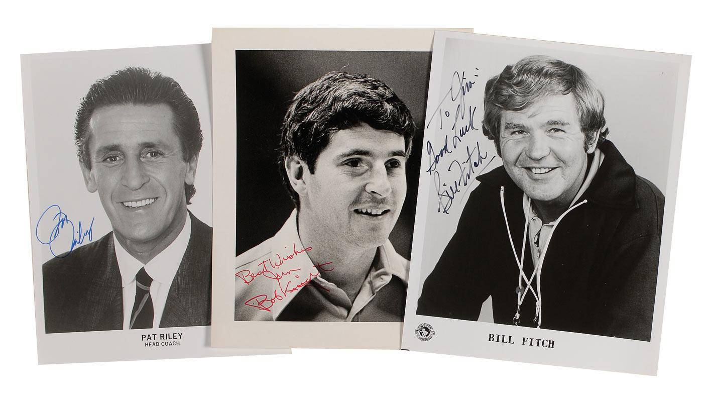 Three glossy photos, all 8 x 10, each signed in felt tip by the respective coach pictured. Signers are: Bob Knight (ins), Pat Riley, and Bill Fitch (ins). In overall fine condition.