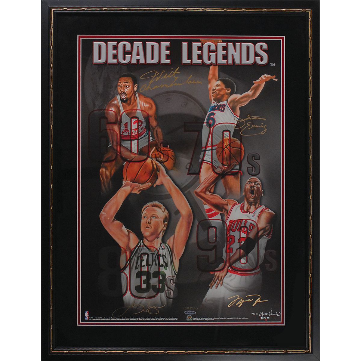 Color limited edition 16.75 x 24 Upper Deck print entitled ‘Decade Legends,’ numbered 129/200, signed in gold ink by all four legends pictured: Wilt Chamberlain, Julius Erving, Larry Bird, and Michael Jordan. Double-matted and framed to an overall size of 23.5 x 31. In very fine condition. Accompanied by a certificate of authenticity from Upper Deck. Oversized.