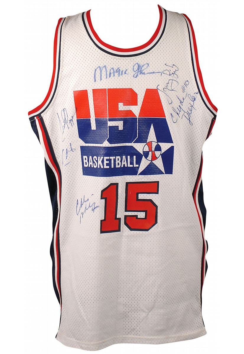 Replica USA Basketball Magic Johnson #15 basketball jersey signed in blue felt tip on the front by Magic Johnson, Larry Bird, Scottie Pippen, Clyde Drexler, Karl Malone, and Charles Barkley. In fine condition.