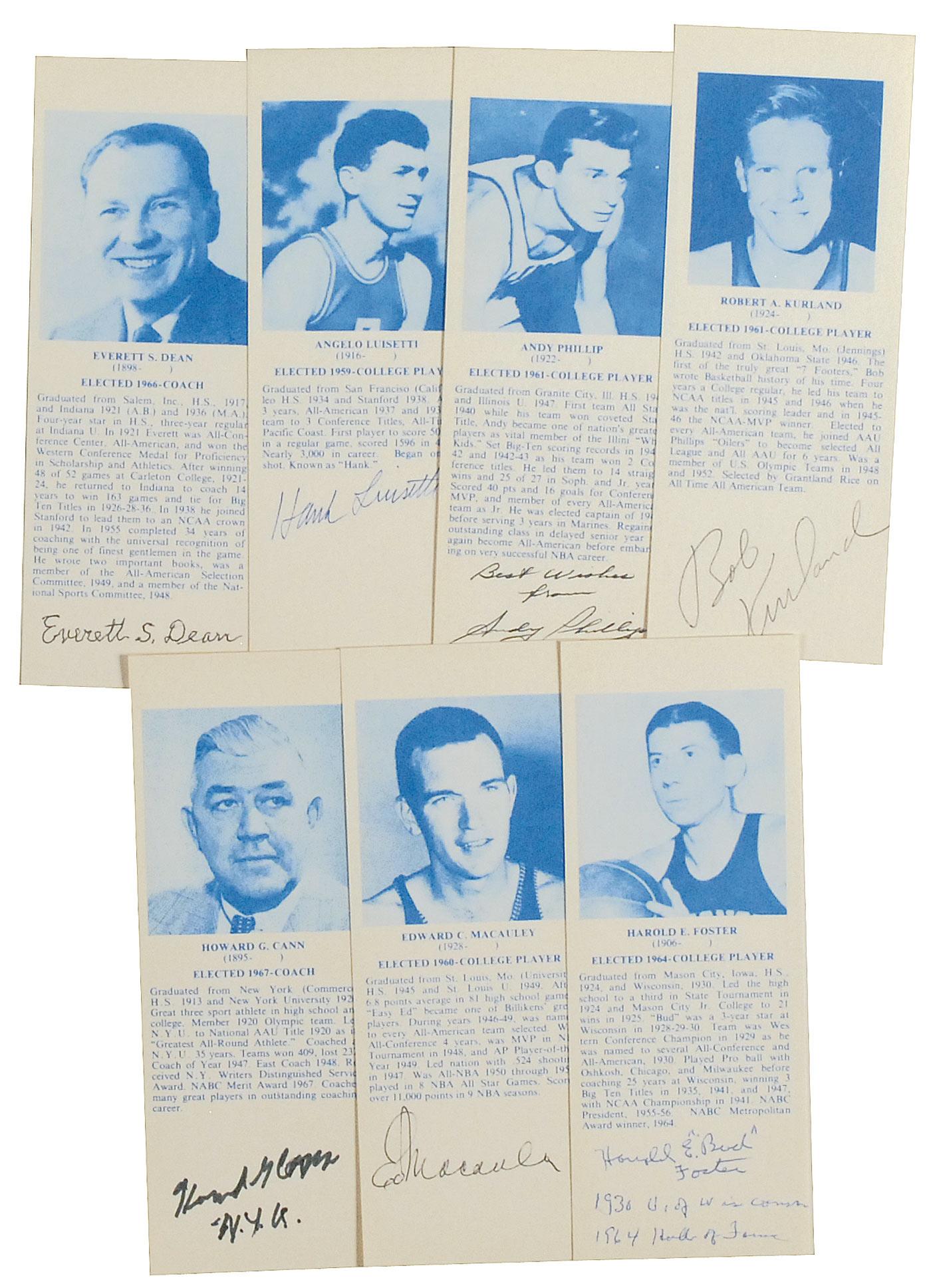 Seven 2.5 x 6.5 Hall of Fame photo cards, each signed in ink or felt tip by the respective Hall of Famer pictured. Signers are: Everett Dean, Hank Luisetti, Andy Phillip, Bob Kurland, Howard Cann, Ed Macauley, and Harold ‘Bud’ Foster. In fine condition.