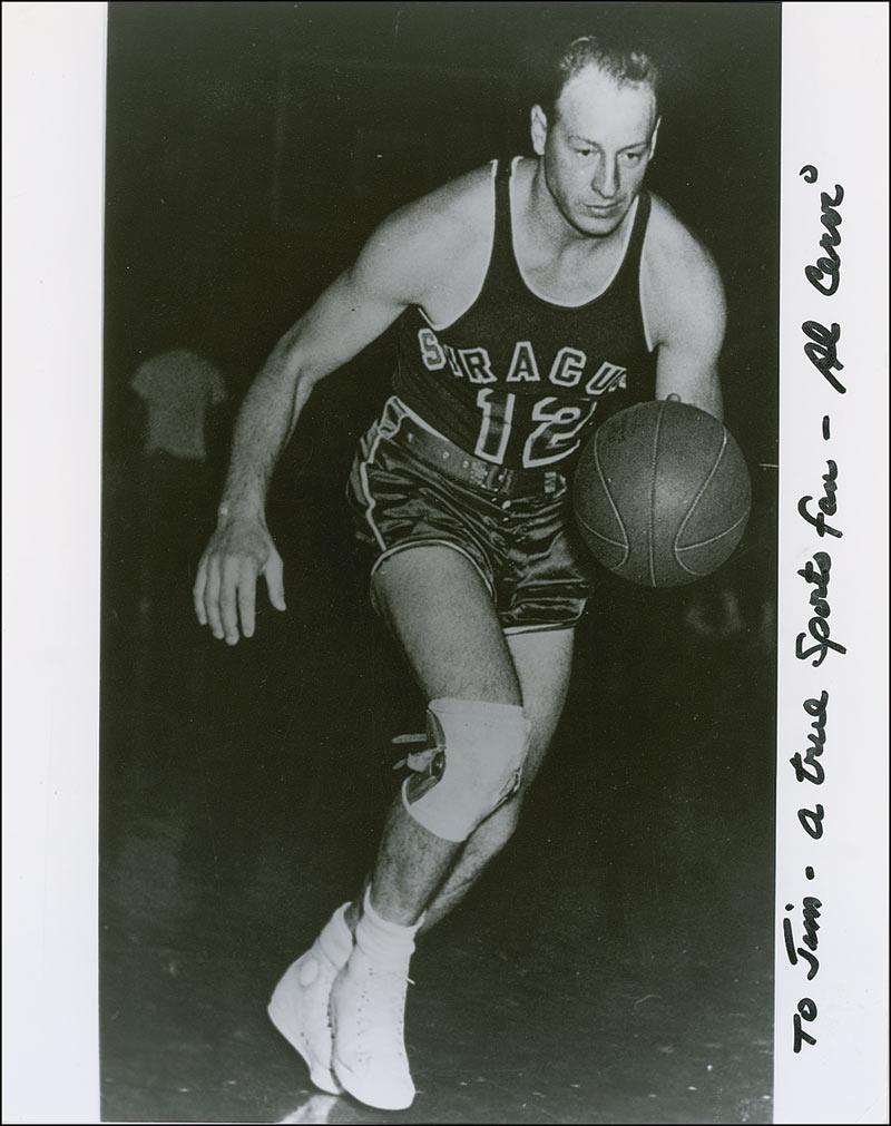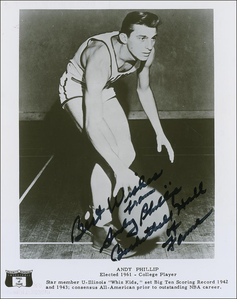 Two signed photos: one glossy 8 x 10 Basketball Hall of fame photo of Andy Phillip signed and inscribed in black felt tip; and a satin-finish 8 x 10 of Al Cervi, signed and inscribed vertically in black felt tip. In fine condition, with small stamp to bottom of Phillip photo, and some scattered light creases.