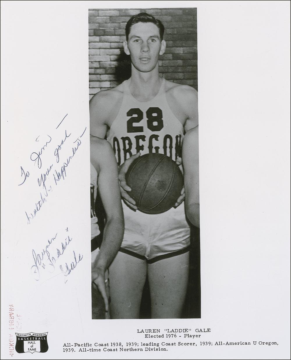Three glossy photos, two 8 x 10 and one 4 x 5, each signed in ink or felt tip by the respective Hall of Famer pictured. Signers are: Lauren ‘Laddie’ Gale (ins), John S. Roosma, and John Ashworth ‘Cat’ Thompson. In fine condition, with a few creases and surface marks to Thompson’s photo, and light irregular ink adhesion to Roosma and Gale photos.