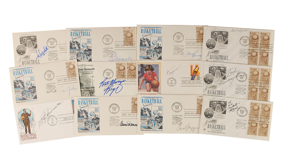 Collection of 12 FDCs, with various cachets, each signed in ink or felt tip by a different Hall of Famer. Signers are: Ed Macauley, Frank Ramsey, Jo Jo White, Jack Twyman, Slater Martin, Big O (Oscar Robertson), Anne Meyers, Tom Gola, Clyde Lovelette, Anne Donovan, Carol A. Blazejowski, and Al Cervi. In fine condition.