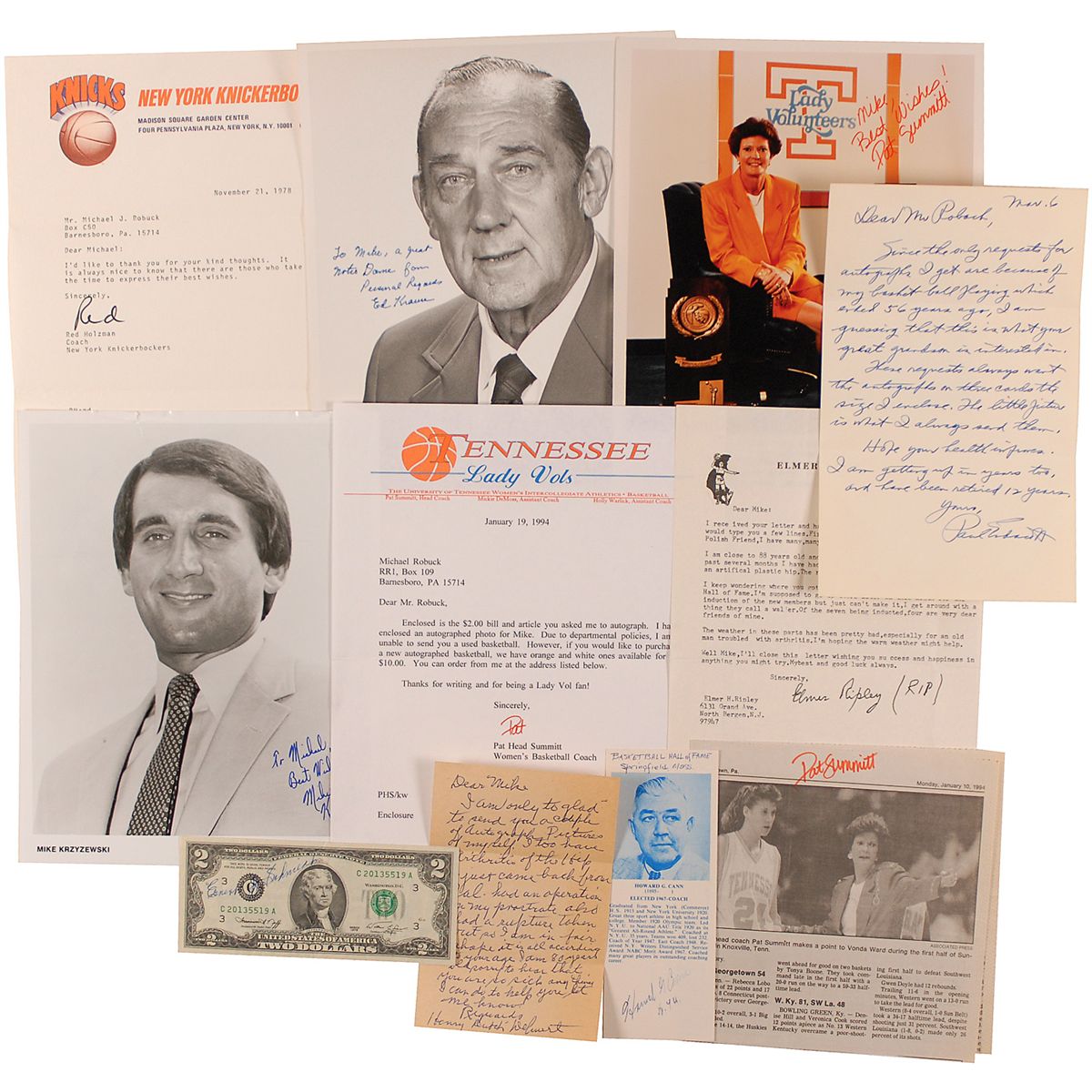 Eleven items: five photos of various sizes and finishes signed in ink and felt tip by Mike Krzyzewski, Pat Summitt (2), Howard G. Cann, and Ed Krause; ALSs from Paul Endacott and Henry ‘Dutch’ Dehnert; TLSs from Elmer Ripley, Pat Summitt, and Red Holzman; and a $2 bill signed in ballpoint by Ernest Schmidt. In very good to fine overall condition.