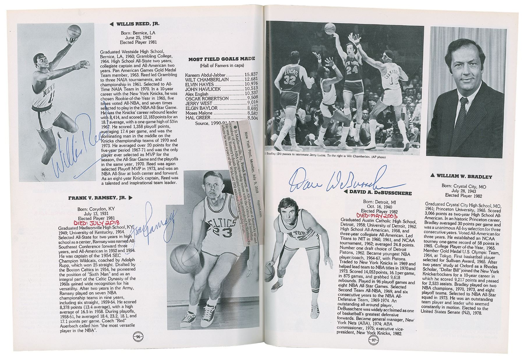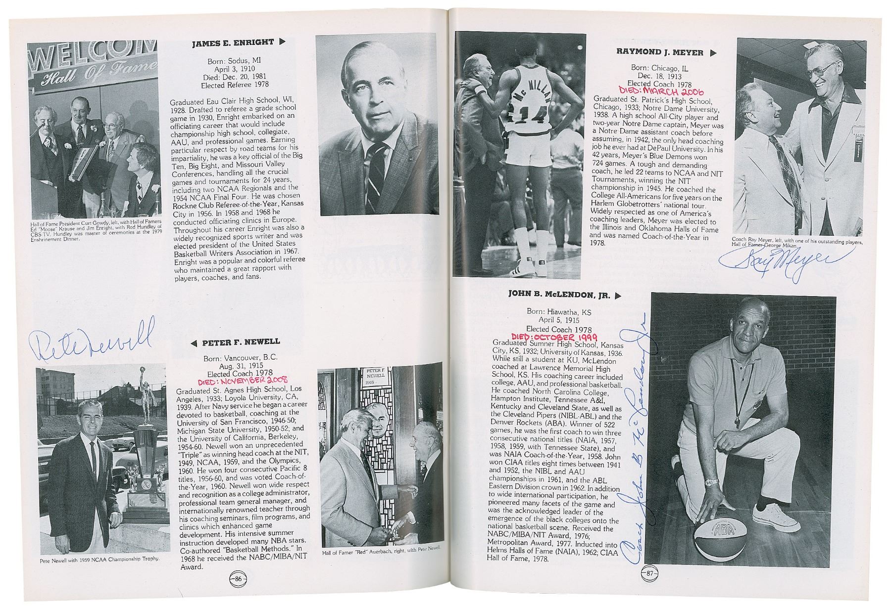 Basketball Hall of Fame yearbook from 1991 featuring cover artwork by LeRoy Neiman, 8.5 x 11, 128 pages, signed on the front cover in black felt tip by Neiman, and throughout in various inks by 38 Hall of Famers, including: John Wooden, Ed Macauley, Andy Phillip, Bob Kurland, Everett Dean, Ben Carnevale, Bob Cousy, Bob Petit, Paul Endacott, Dolph Schayes, Tom Gola, Jim Pollard, Cliff Hagan, Pete Newell, Ray Meyer, John McLendon, Oscar Robertson, Lester Harrison, Dallas Shirley, Arad McCutchan, Clarence Gaines, Willis Reed, Frank Ramsey, Dave DeBusschere, John Havlicek, Jack Gardner, Mary Harshman, Red Holzman, Tom Heinsohn, Fred Taylor, Stan Watts, Rick Barry, Walt Frazier, Bob Wanzer, Ralph Miller, K.C. Jones, Pop Gates, and Earl Monroe. In fine condition, with collector's annotations throughout indicating death dates.