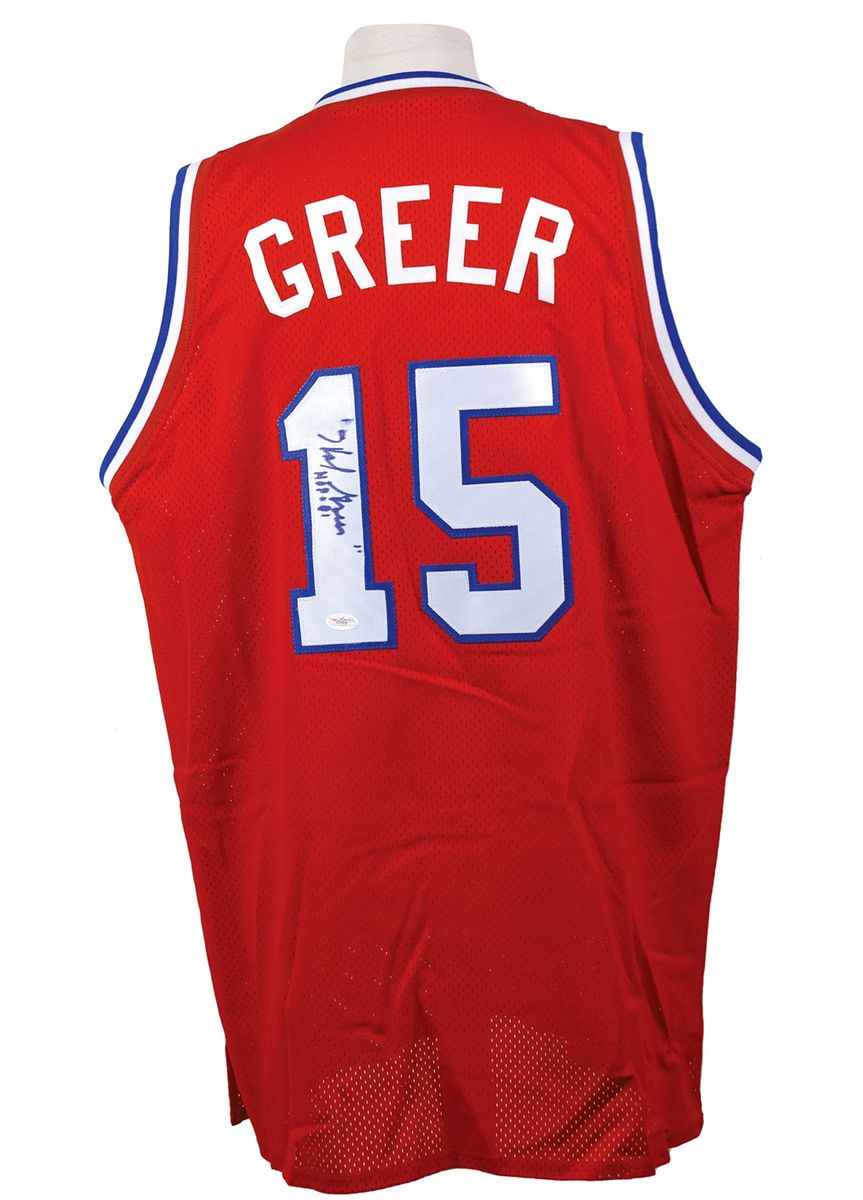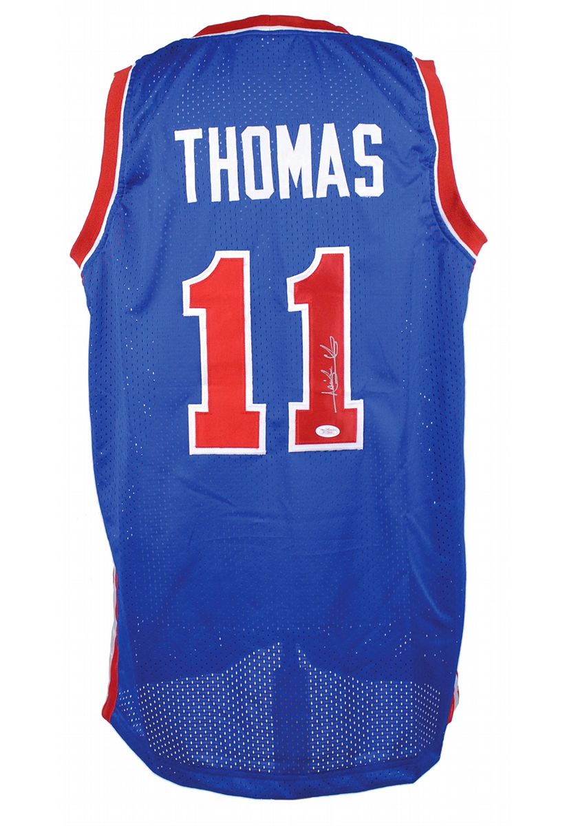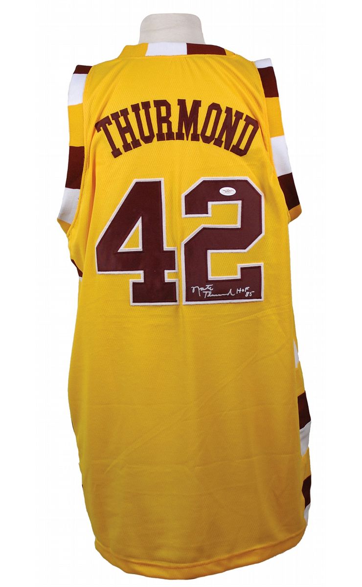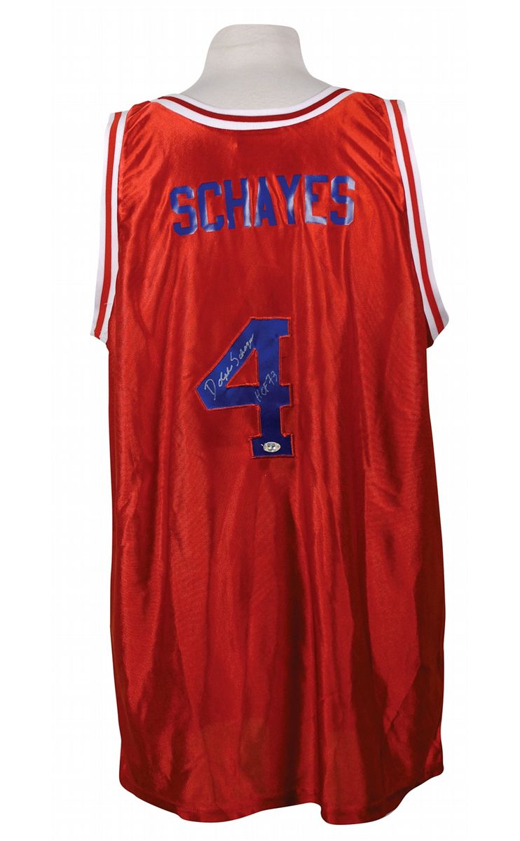 Collection of nine replica basketball jerseys, most with sewn on letters and numbers, each signed in ink or felt tip by the player represented on the jersey. Signers are: Dave Cowens, Chris Paul, Isiah Thomas, Nate Thurmond, Dolph Schayes (2), Larry Johnson, Alonzo Mourning, and Hal Greer. In fine condition. Five of the jerseys are accompanied by certificates of authenticity from James Spence.