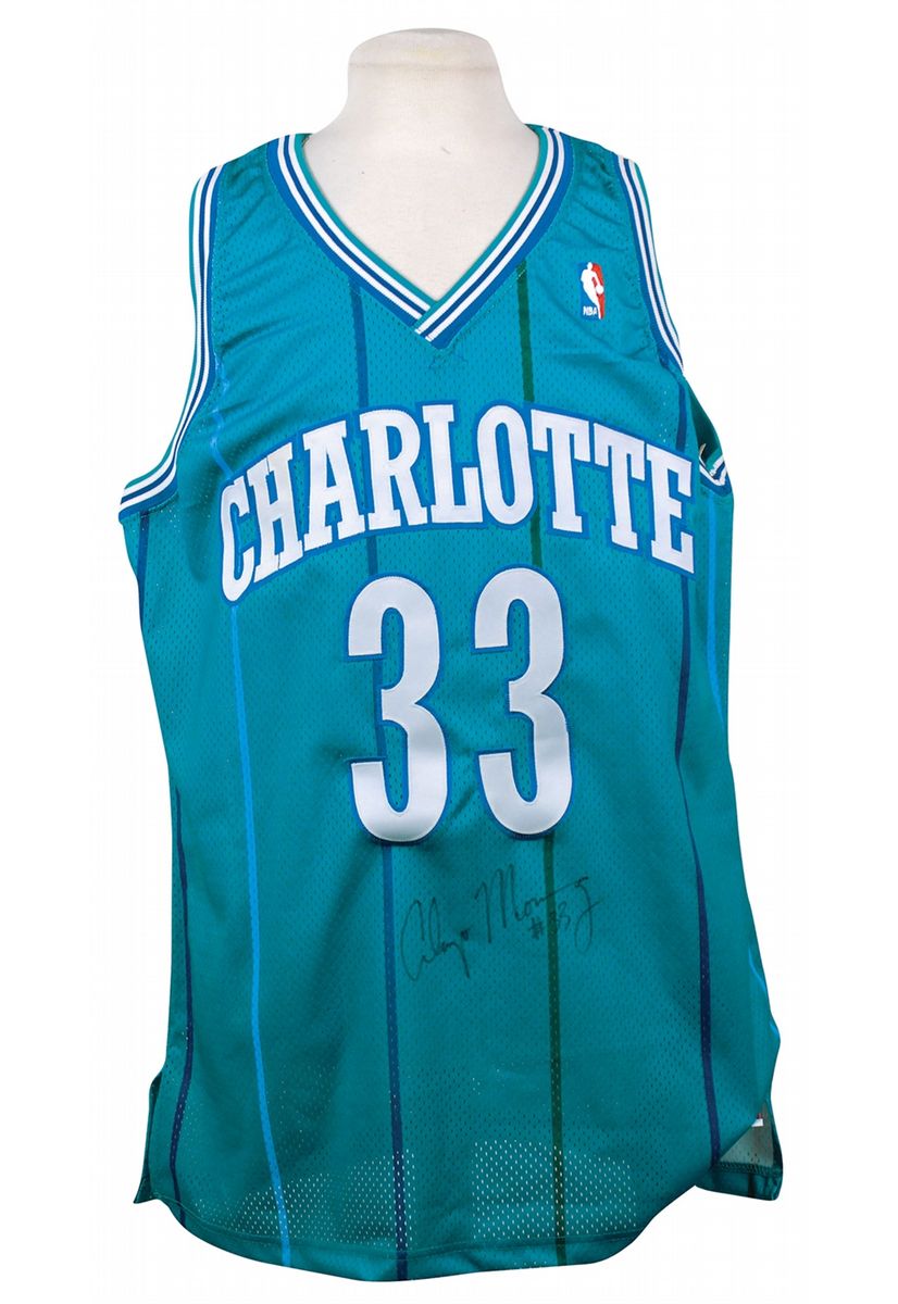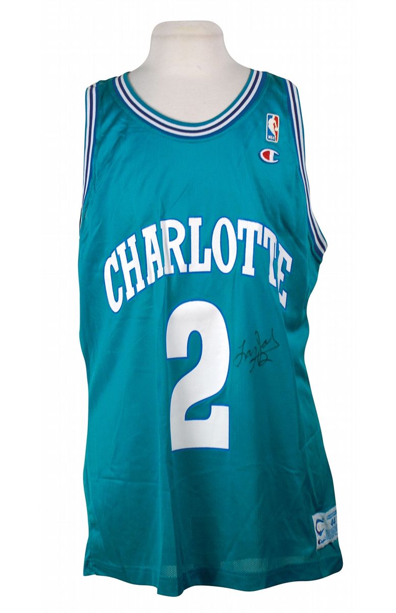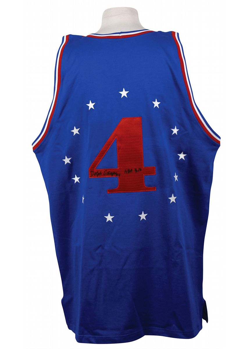 Collection of nine replica basketball jerseys, most with sewn on letters and numbers, each signed in ink or felt tip by the player represented on the jersey. Signers are: Dave Cowens, Chris Paul, Isiah Thomas, Nate Thurmond, Dolph Schayes (2), Larry Johnson, Alonzo Mourning, and Hal Greer. In fine condition. Five of the jerseys are accompanied by certificates of authenticity from James Spence.