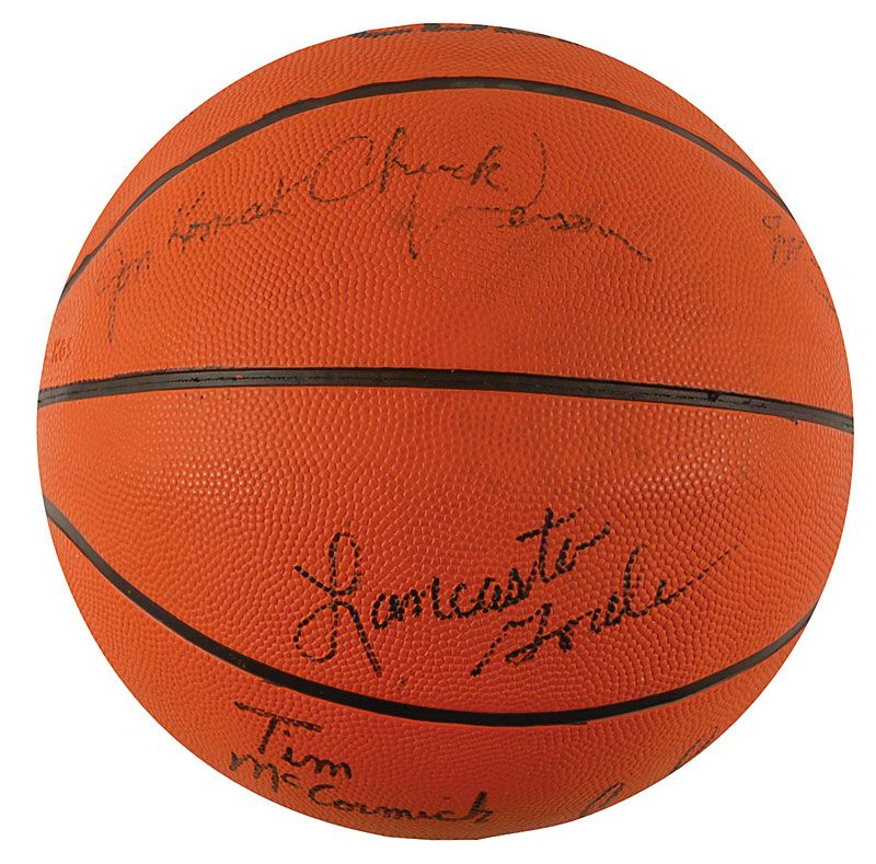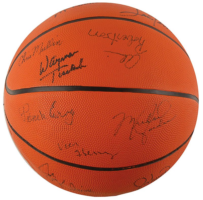 Official AMF Voit basketball signed in black felt tip on the side panels by 16 players who participated in the trials for the 1984 USA Olympic basketball team. Signers are: Michael Jordan, Patrick Ewing, Chris Mullin, Steve Alford, Vern Fleming, Tim McCormick, Sam Perkins, Johnny Dawkins, Lancaster Gordon, Chuck Person, Jeff Turner, Jon Koncak, Leon Wood, Joe Kleine, Wayman Tisdale, and Alvin Robertson. In fine condition. Accompanied by a full letter of authenticity from PSA/DNA.